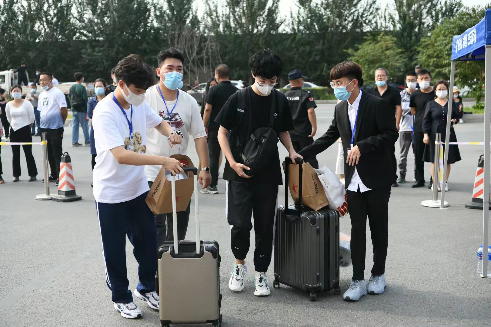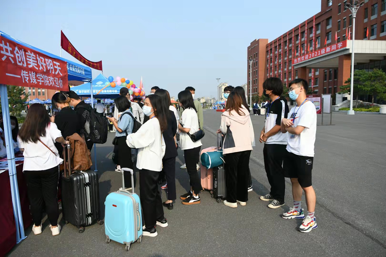 在校门口迎接新生的传媒万博体育官网的同学们热情的为萌新们拎行李并解答新生家长的各种疑问。带着他们经过疫情防控组的志愿者们为各位新生进行测温检查并对行李物品消毒处理的地方,并在校内再次进行核酸检测,确保入学期间的疫情安全。为更好地迎接新生的到来,传媒万博体育官网的志愿者们提前到达固定的站点,为萌新们做好引导、登记、搬运等服务工作。