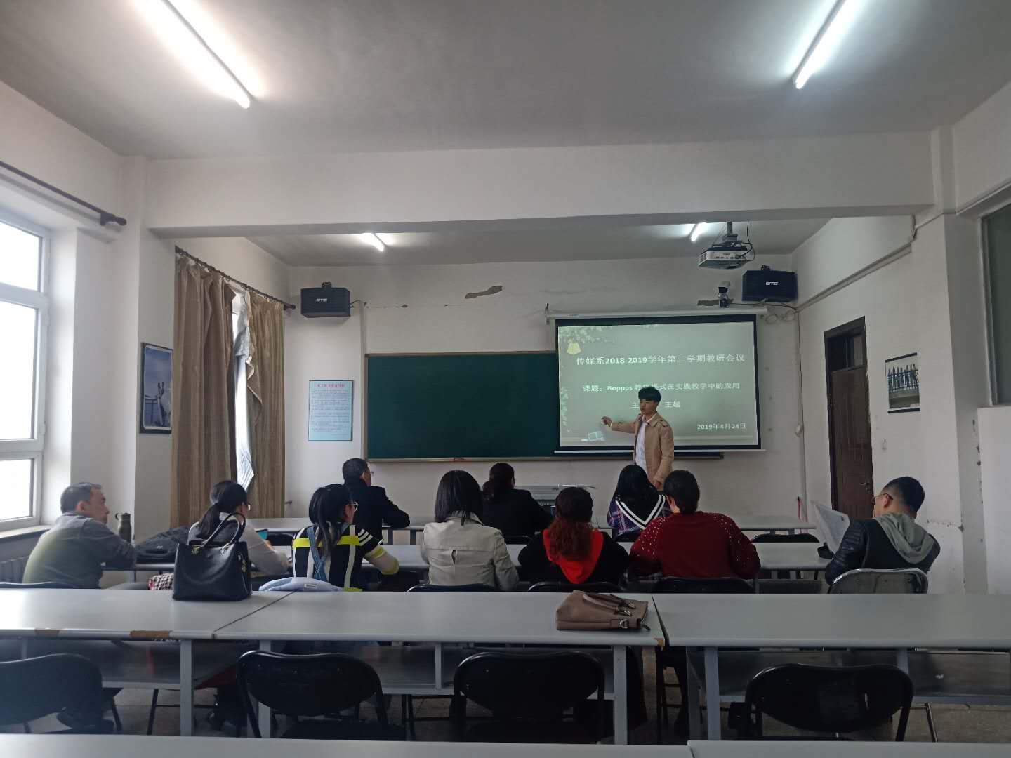 2019年4月24日下午,我系组织本学期第二次教研活动。这次活动以“Boppps教学模式在实践教学中的应用”为主题研讨。传媒系主任、副主任及全体教师参加研讨会。