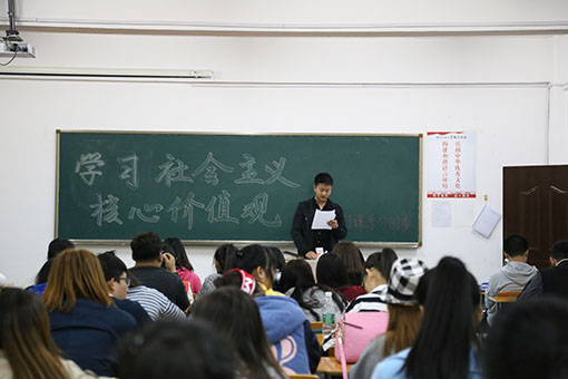 从2012年11月,十八大报告首次概括学习社会主义核心价值观的基本理念,在学校,生活等各个方面都在宣传这一重要思想。在今天团会日的重要会议上,广播电视编导2班的团支书表示:“社会主义核心价值观其内容为24个字的含义将一次又一次深刻并铭记在我们心中。“自由,平等,公正,法治。”,是对美好社会的生动表述。“爱国,敬业,诚信,友善。”是公民基本道德规范。其两者分别是从社会层面和个人行为层面对社会主义核心价值观基本理念的凝练,反映了中国特色社会主义的基本属性,是我们矢志不渝,长期实践的核心价值理念。”对于价值理念,广播电视编导4班的团支书表示:“社会的核心价值观是社会价值理念、社会价值尺度的核心和灵魂.是一个国家的、社会的、民众的价值理念。中国特色的核心价值观必须基于现时代党的理论支撑和现实国情。”
