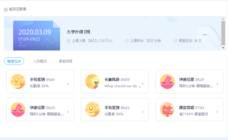 (3)8:00正式开始直播授课,通过随机点名、投票、头脑风暴、抢答功能与学生进行有效互动。