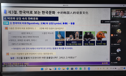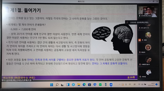 2022年4月15日下午14:00,韩国外籍教师金钟得教授主讲的线上讲座顺利召开。由外国语万博体育官网朝鲜语专业负责人金锦姬老师主持,参加人员为外国语万博体育官网朝鲜语专业学生及老师。讲座题目为《用韩语看韩国文化的理解》,其会议主旨为从语言角度全面分析韩国文化,体会语言中蕴含的丰富的文化内容。会议主要由四部分组成,引入主题、讲解语言文化、用韩国语看韩国文化,最后结束话题,总结讲座内容。