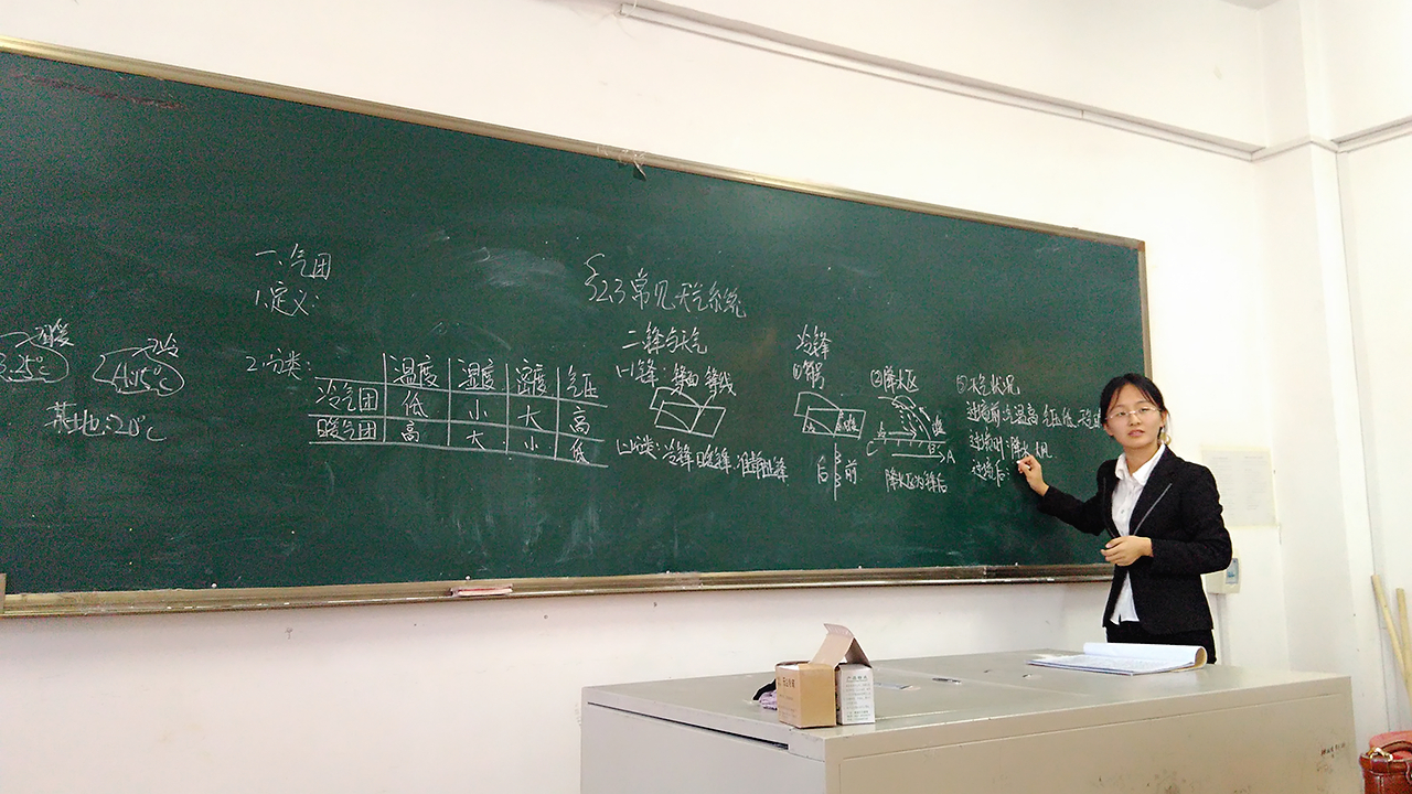 课堂教学技能训练考核采取汇报讲课的形式,学生按照既定顺序依次进行讲课,规定时间为10分钟。本次讲课要求学生采用传统教学方式授课,重视教学基本功的展现,充分锻炼和考验学生的教学能力。经过训练,学生对教学内容的把握准确而熟练,教学目标明确,语言表达流畅,板书、板画设计合理。大部分同学教态稳重端庄,教学方法富有启发性,已具备地理教师的素质和风范。整个考核过程组织有序,参与考核的专职教师打分公平公正,学生间不仅相互认真听课,也积极进行配课,气氛严肃又不失活跃。