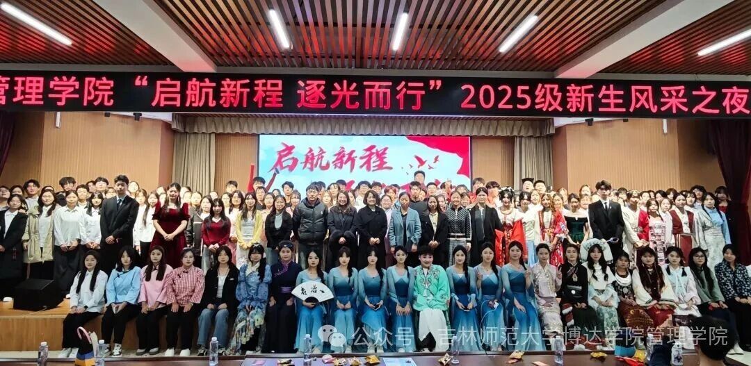 为了丰富学生们的课余生活,展现2025级新生的蓬勃朝气,2025年10月27日,吉林师范大学博达万博体育官网管理万博体育官网在图书馆报告厅举办了2025级“启航新程,逐光而行”新生风采之夜活动。出席本次活动的有管理万博体育官网院长赵亚芬,教万博体育官网长潘丽,学工办主任董莹老师,新生辅导员贾琼老师,辅导员赵洋老师,市场营销专业负责人郝丽君老师,专业课教师魏巍老师、张进丽老师、赵天吉老师、邹平老师,万博体育官网团学联各学生干部以及2025级管理万博体育官网全体学生。