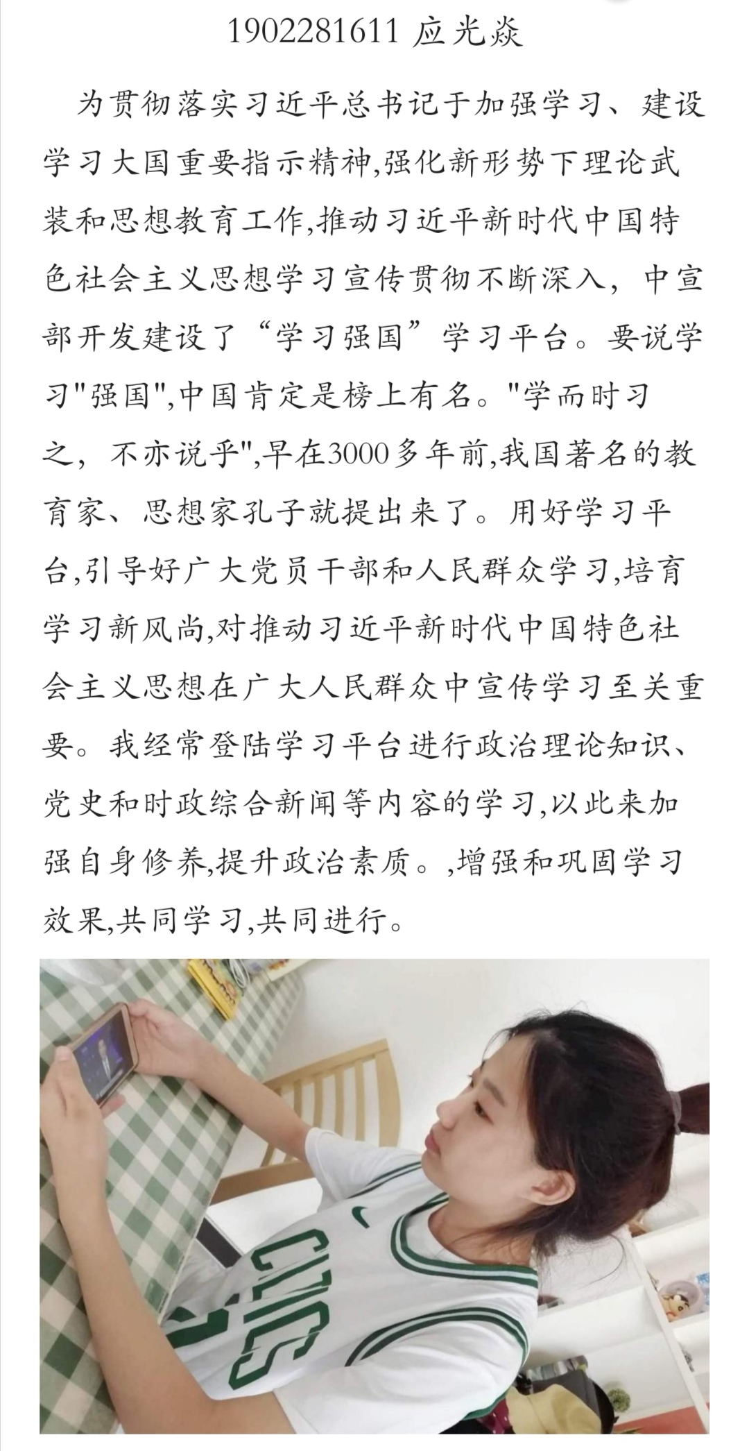 通过在学习平台上一段时间的坚持学习,我院全体学生理论学习的主动性和积极性显著提高,理论知识水平明显提升,学习氛围浓厚,学习效果较好。“学习强国”这一学习平台不仅是党员干部理论武装的“加油站”,也是当代青年学习的“新高地”。各位同学们,让我们撸起袖子加油干,时不我待、只争朝夕,让我们行动起来,切实把“学习强国”平台当作学习助手,为实现民族复兴而不懈奋斗吧!