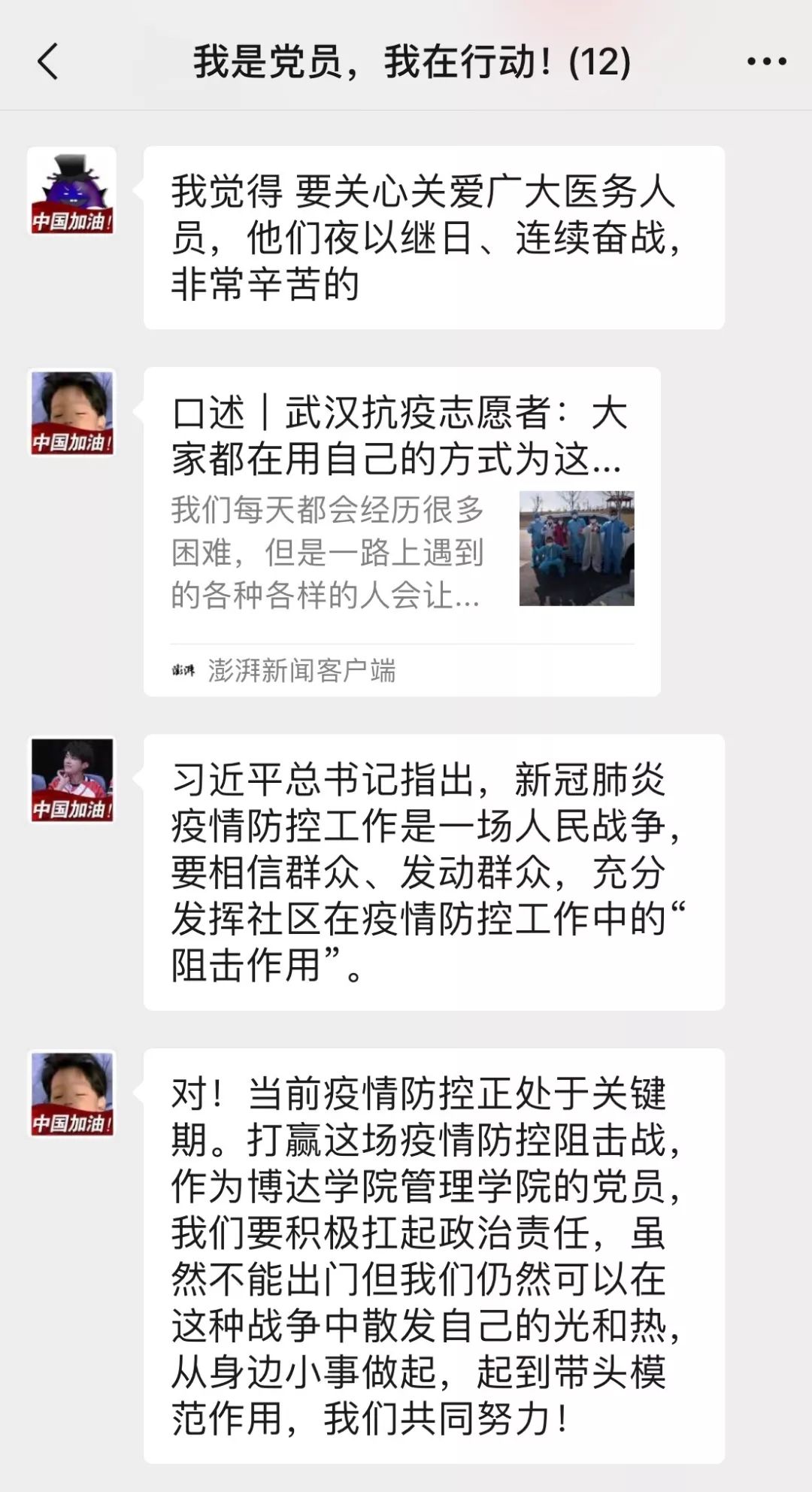 在疫情防控期间,我院学生党员及积极分子坚持发挥示范作用,自觉遵守居住地疫情防控要求。为促进广大同学居家时的身心健康,学生党员以微信平台为载体,建立学生党员学习行动群、“学习精神