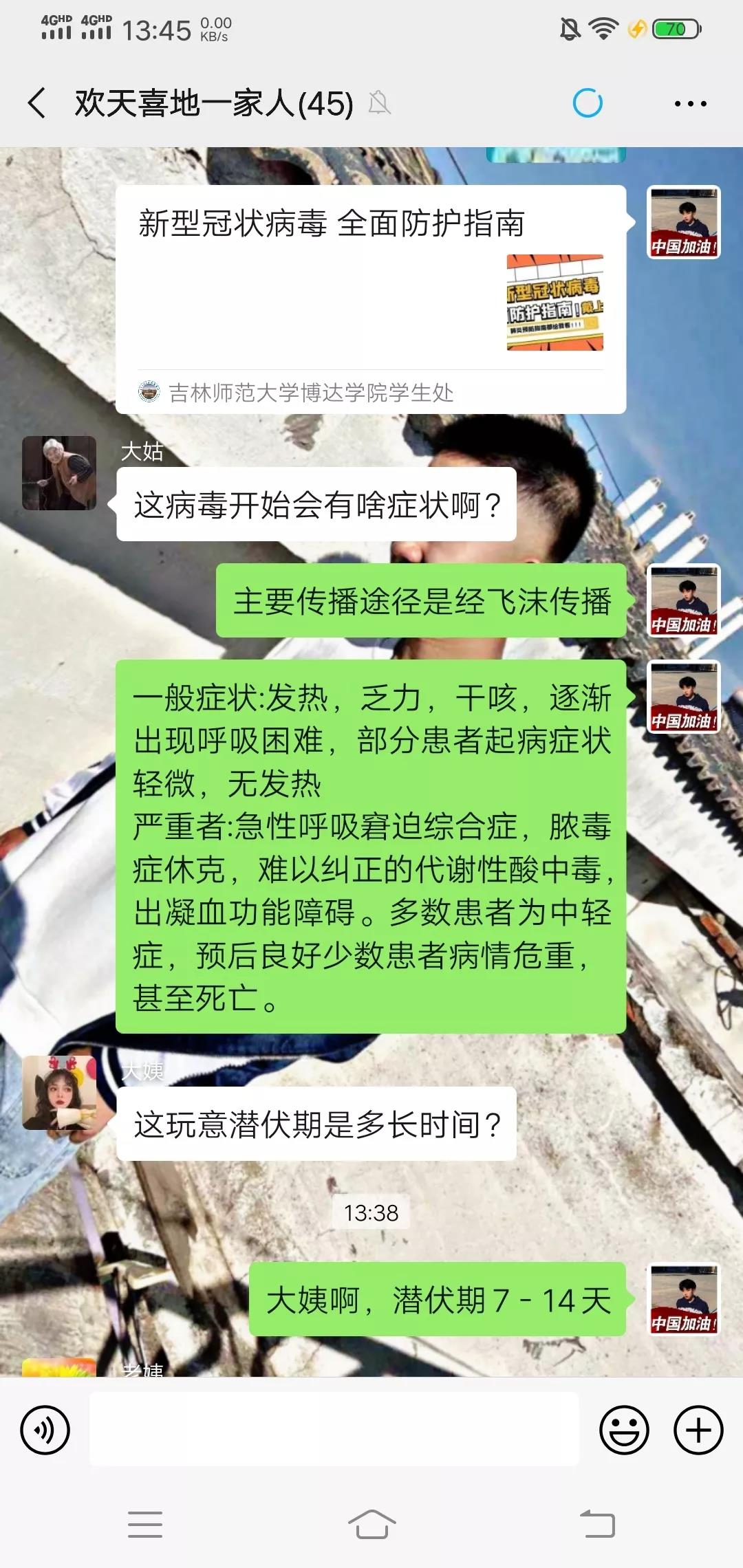 为积极做好新型冠状病毒感染的肺炎疫情防控工作,吉林师范大学博达万博体育官网管理万博体育官网学生党支部党员及积极分子考虑到农村万博体育官网疫情信息传达不及时、不通畅的问题,他们身处在各自农村,主动作为,积极宣传防疫知识,纷纷投身防疫一线,为打赢疫情防控阻击战贡献一份积极的力量。