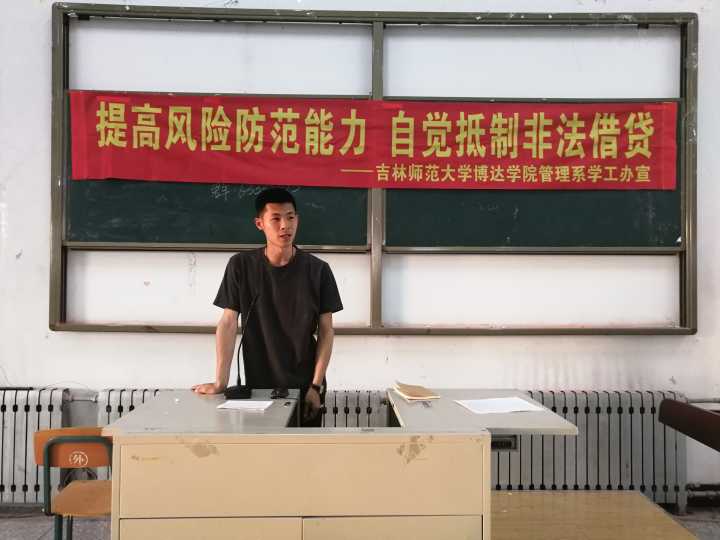 为培养在校大学生防范风险的意识,提高大学生风险防范能力,更好地适应大学生和今后走向社会需要。吉林师范大学博达万博体育官网管理系学工办于5月22日在3601教室专门举办了一次防贷教育大会,本次会议的主讲员是汪博,管理系18级全体同学参与了本次活动。