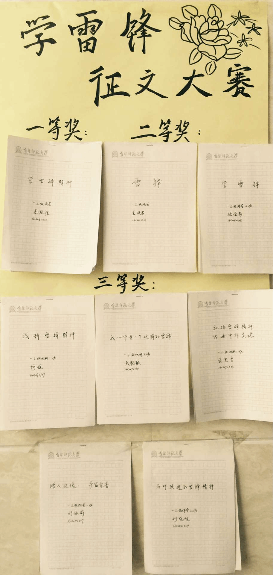 此次活动中,同学们踊跃报名,积极参与,各抒己见。学生们都对雷锋精神进行高度赞扬,并且都提出了个人对于雷锋精神的不同见解,表明了自己向雷锋同志学习的决心,发出向雷锋同志学习的倡议。征文各有千秋,最终有8名同学脱颖而出,其中一等奖1名,二等奖2名,三等奖5名。