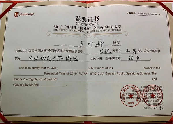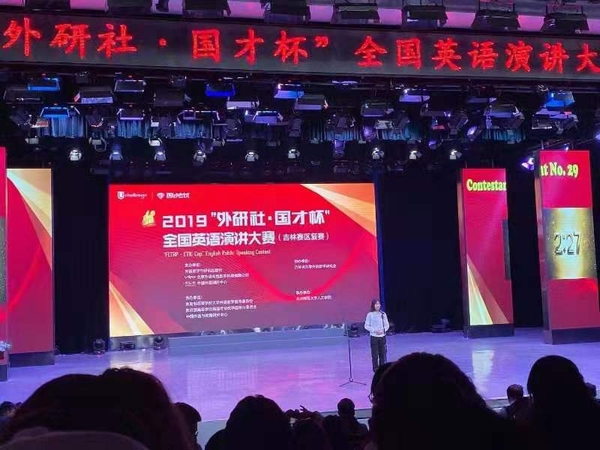 10月19日,由吉林省大学外语教育研究会等单位主办的2019“外研社杯”全国英语演讲大赛吉林赛区复赛在东北师范大学人文万博体育官网落下帷幕。我校文万博体育官网2017级学生卢竹婷(指导教师张严),获得省赛三等奖。