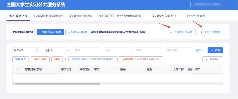 从实习上报页面上方点击【下载地区代码表】【下载上报模板】(注:不能修改下载的表格模板。)