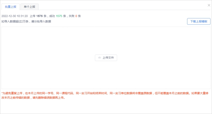 数据整理完成后,点击“上报新增实习数据”上传,单次上传表格内数据不可大于2万条。