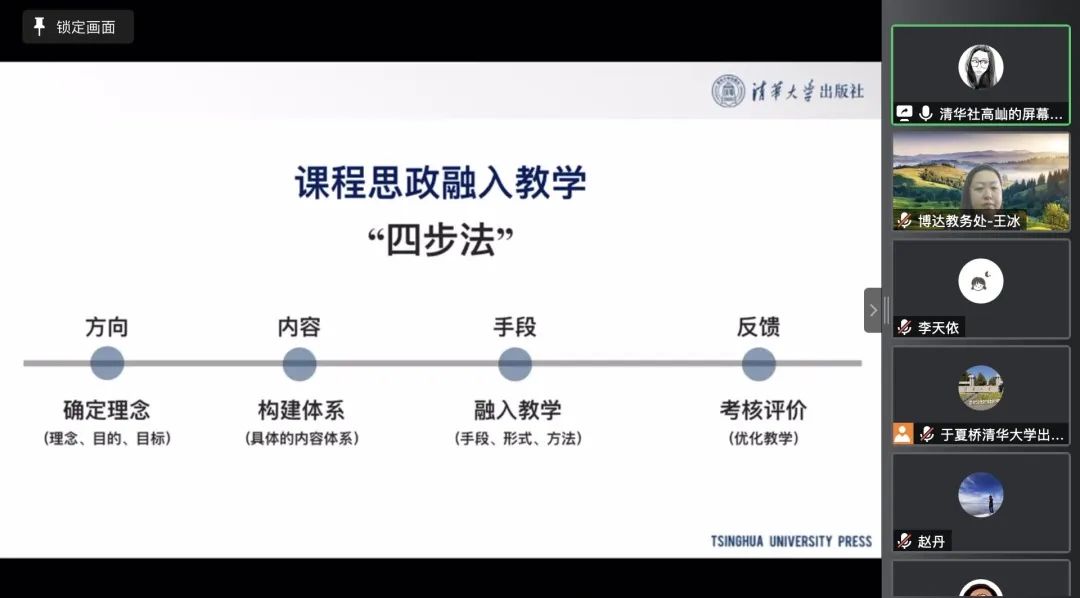 本次讲座上,清华大学出版社的三位编辑从课程思政如何融入课堂、第五事业部教材产品介绍、课件下载方式及样书申请几个方面提供了课程思政建设方面优秀的教学资源,仔细解读了课程思政融入教学的意义与方法。