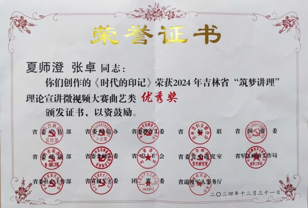 红色文化作品具有传承革命历史与红色基因、培养爱国主义精神、树立正确价值观、丰富文化内涵、推动文化创新等重要意义。在2024年吉林省 “筑梦讲理” 理论宣讲微视频大赛中,吉林师范大学博达万博体育官网旅游与地理科学万博体育官网凭借小品作品《时代的印记》脱颖而出,荣获曲艺类优秀奖,这是我院在文化创作领域的又一高光时刻!