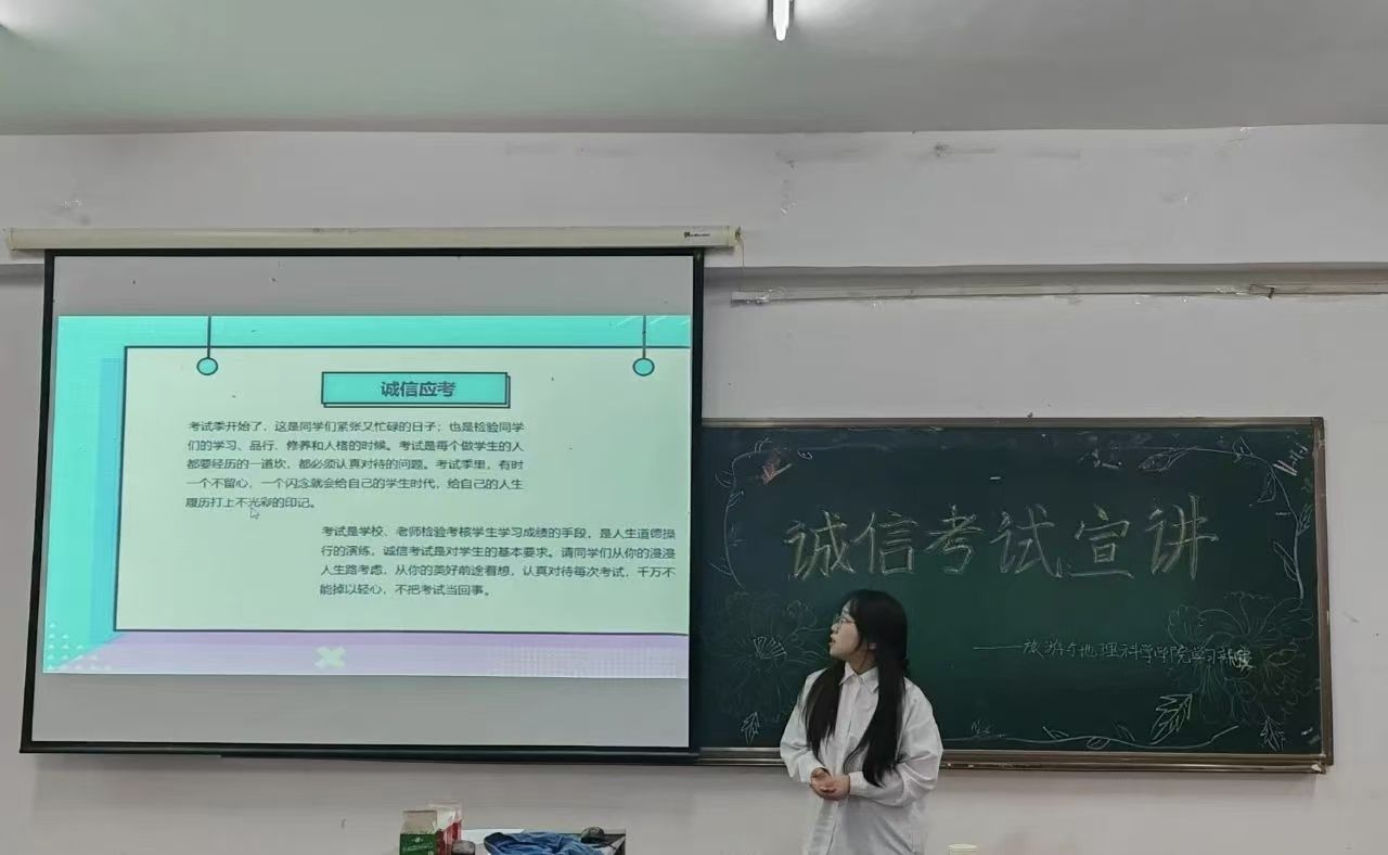 “文以行为本,在先诚其中。”为了使同学们对诚信考试有明确的认识,在今后的学习生活中树立以诚信为本,努力学习、文明考试,从根源上杜绝作弊现象的发生,旅游与地理科学万博体育官网学生会学习部于2024年6月16日18:30在三教3322教室举行诚信考试宣讲会。2023级全体同学参加了这次宣讲会。