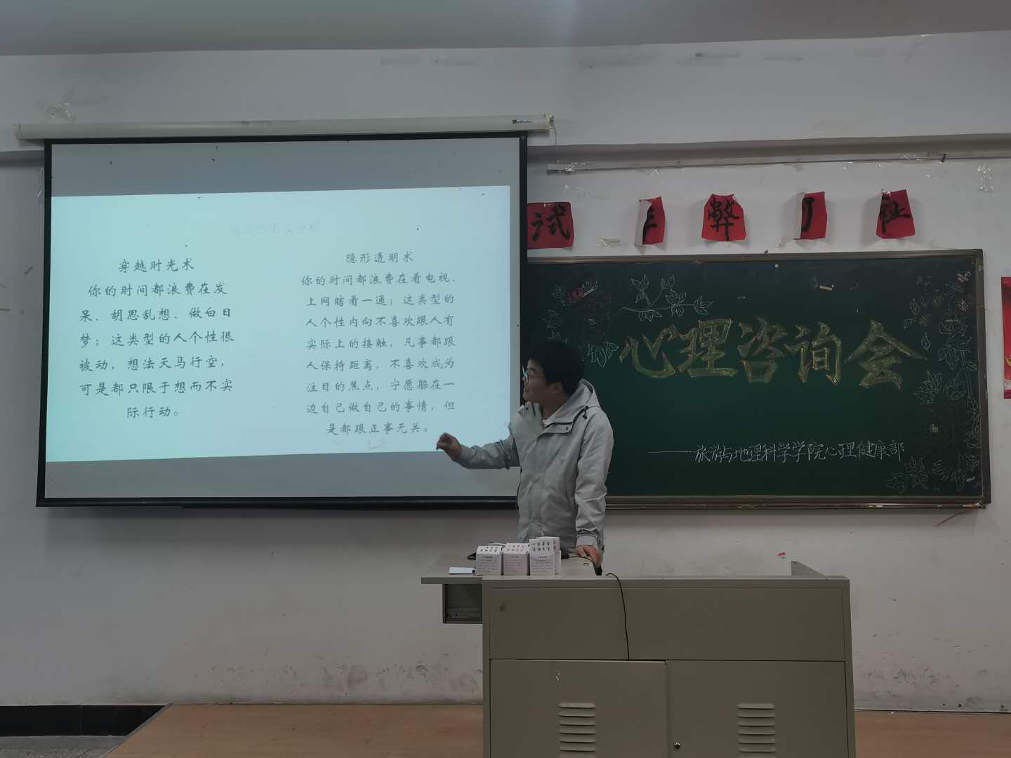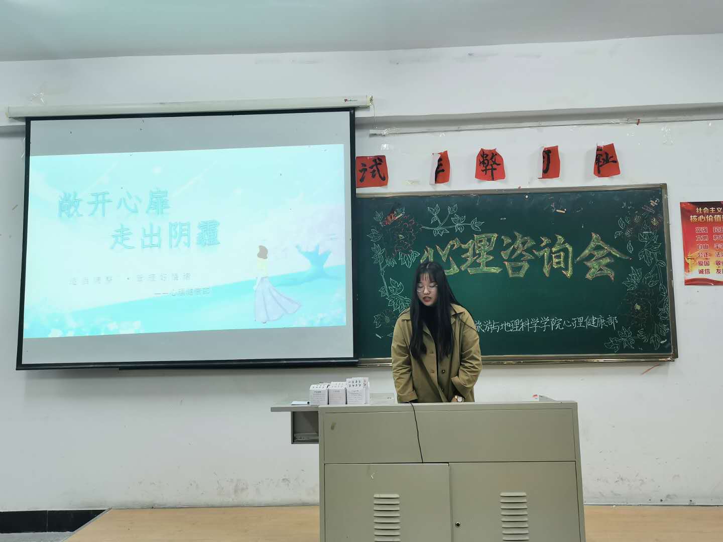 为帮助同学走出疫情期间的阴影,排解心中所累积的压力。树立正确的人生观、价值观、世界观,恢复良好的心态,积极阳光的开展疫后新生活,关注大学生的心理健康问题。吉林师范大学博达万博体育官网旅游与地理科学万博体育官网社团联合会心理健康部于10月12日在3322教室举办以“敞开心扉,走出阴霾”为主题的心理咨询会。