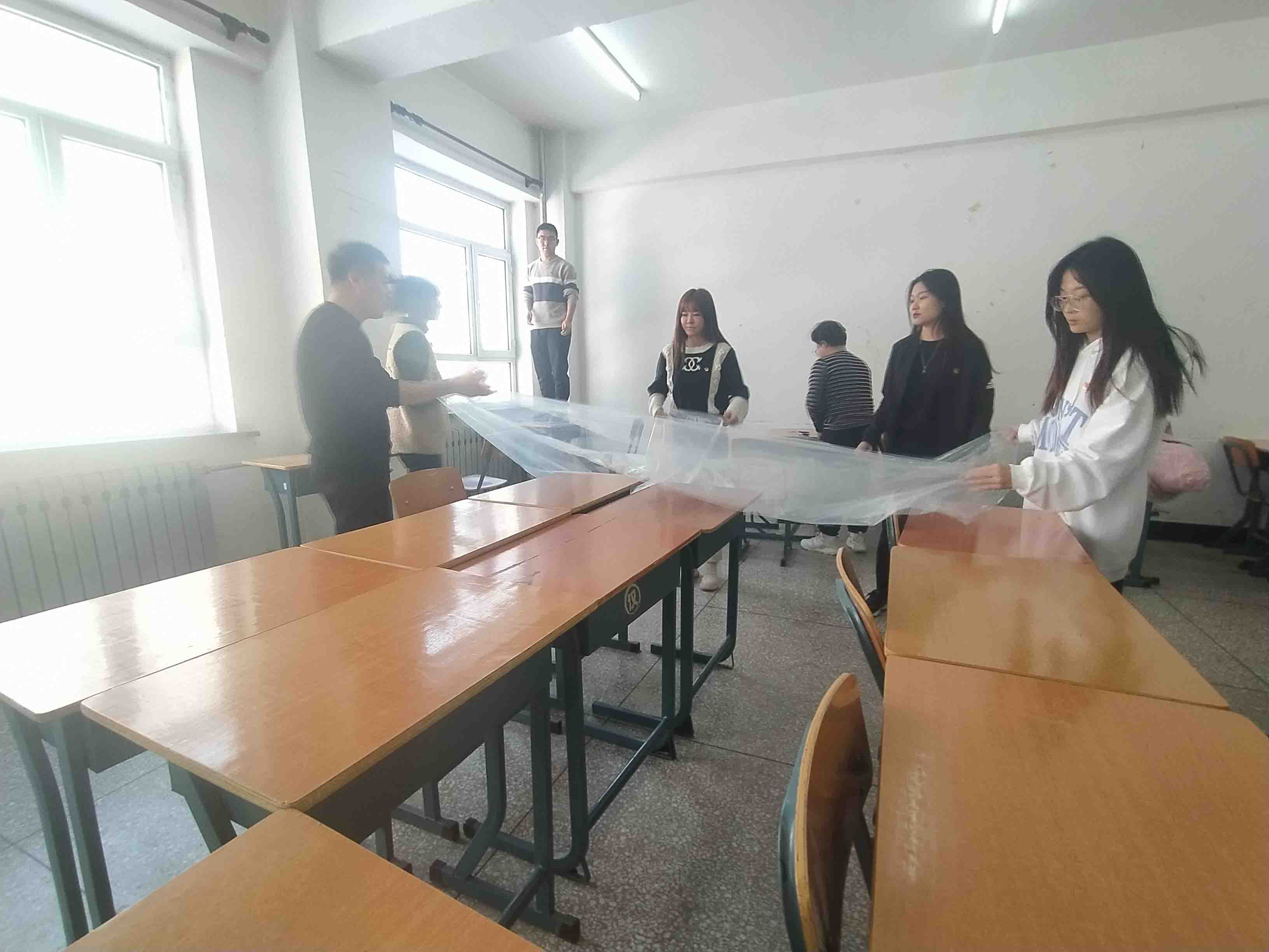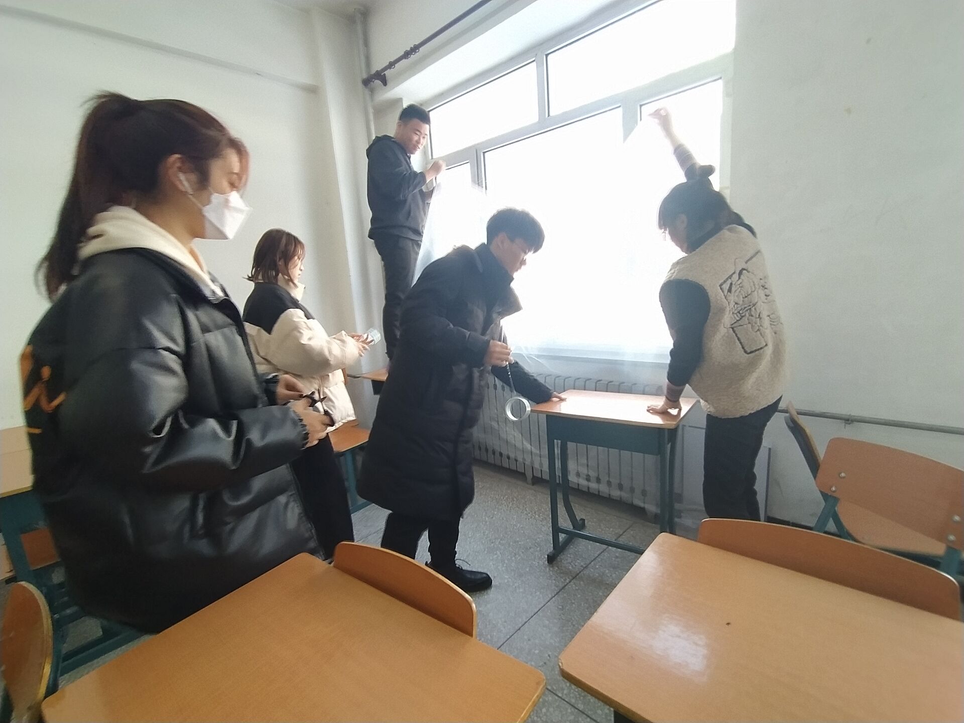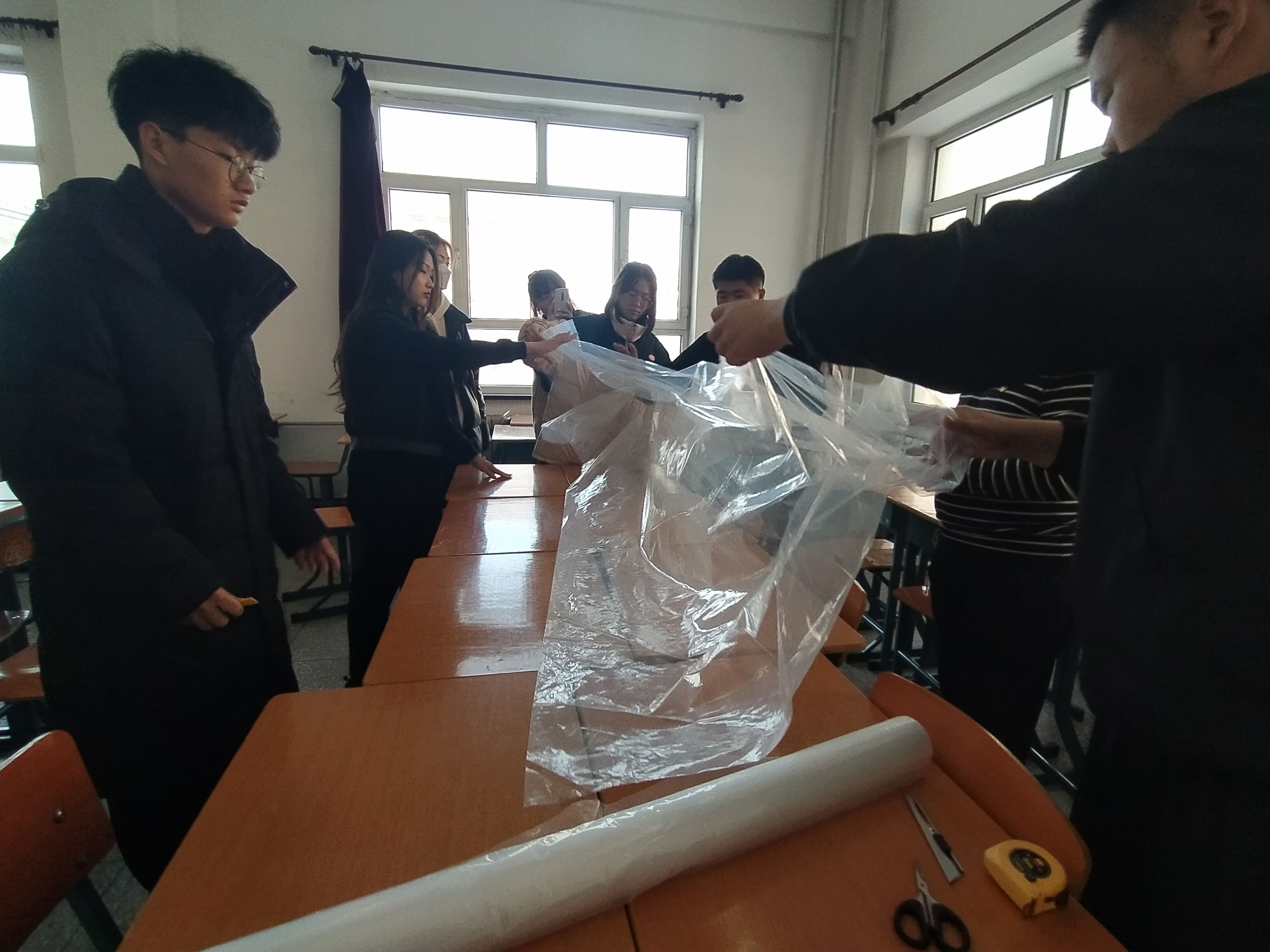 党员们按尺寸量好保温膜,将保温膜一张张裁剪好,认真粘合胶带,确保每一处与保温膜贴合,并且仔细检查是否有空隙,防止暖气外散。旅游与地理科学万博体育官网直属党支部书记柳志明同志更是亲自上阵粘贴保温膜,在柳志明同志的带领下,教室保温工作圆满完成。