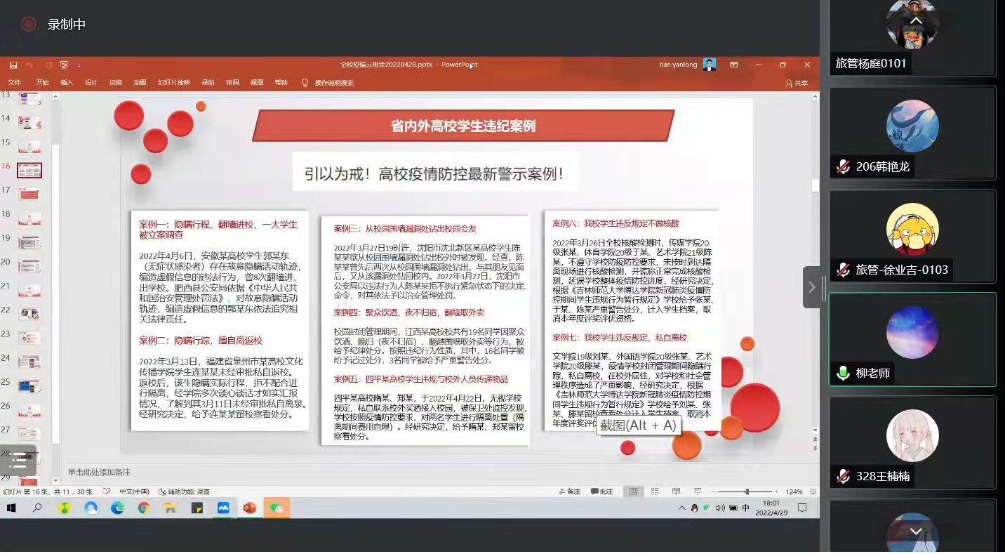 会议主要从高校疫情案例警示、本市防控措施调整、解决学生生活问题、校园防控细节把控等四个方面展开,包括四平政策措施调整、学校外卖网购问题、校园被猫抓伤问题等细节性的问题,柳老师耐心地给我们分享与解答,给予关心的同时也给我们信心。