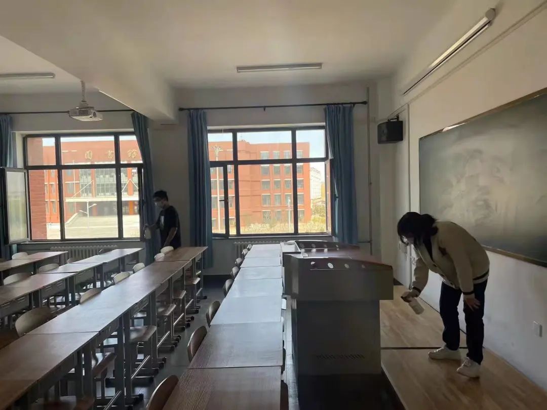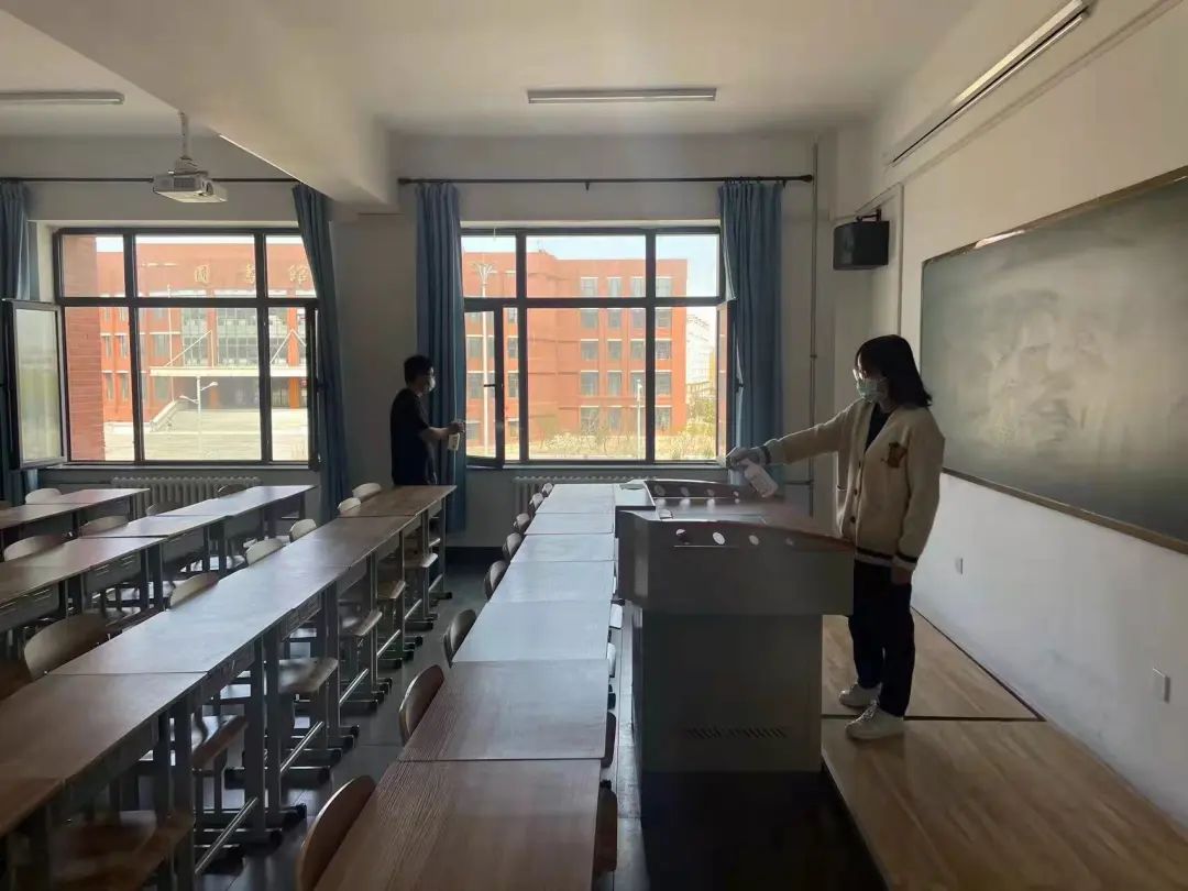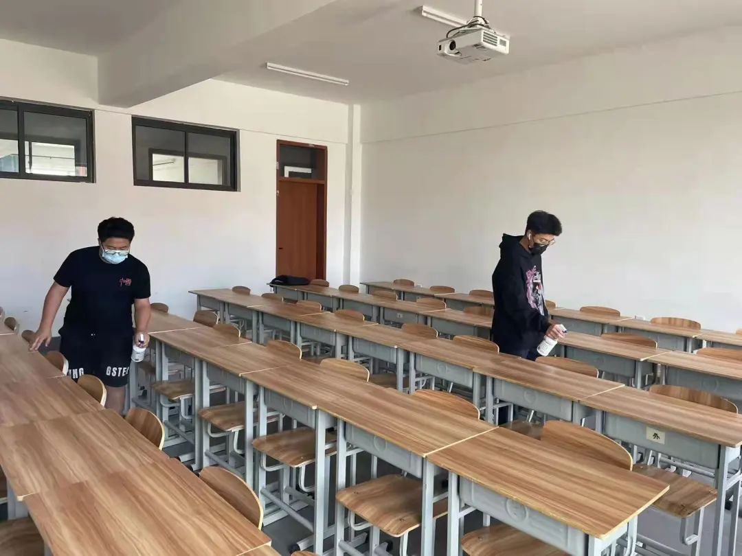 即使现在学校仍然进行网课,暂未开启线下上课,旅游与地理科学万博体育官网的党员们仍自愿参与教室消杀工作。他们手握酒精喷枪,不放过教室里的每一个角落。疫情防不胜防,党员们全心全意投入疫情防疫工作当中,为同学们全心全意服务。