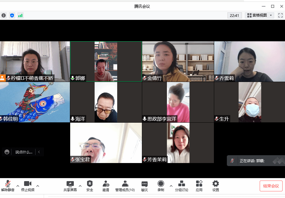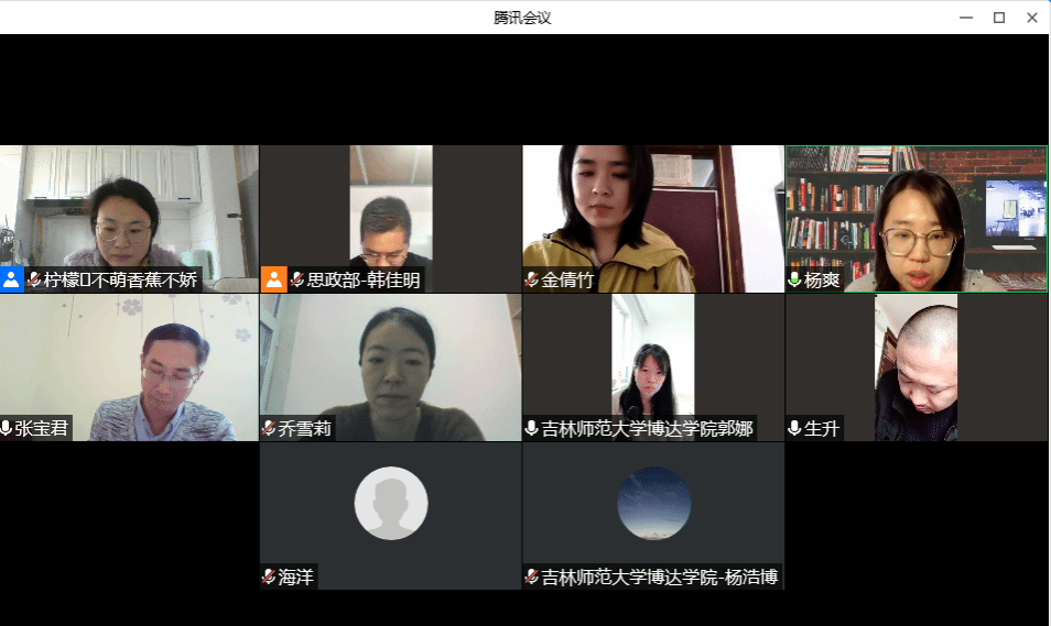 4月6日下午两点,思政部运用腾讯会议如期举行本学期第六次教研活动,很荣幸招生办主任王丽红老师参加本次会议。本次教研活动的题目为《疫情背景下如何优化线上思政课教学》。 首先,李宜洋老师总结了上周思政部线上教学情况:...