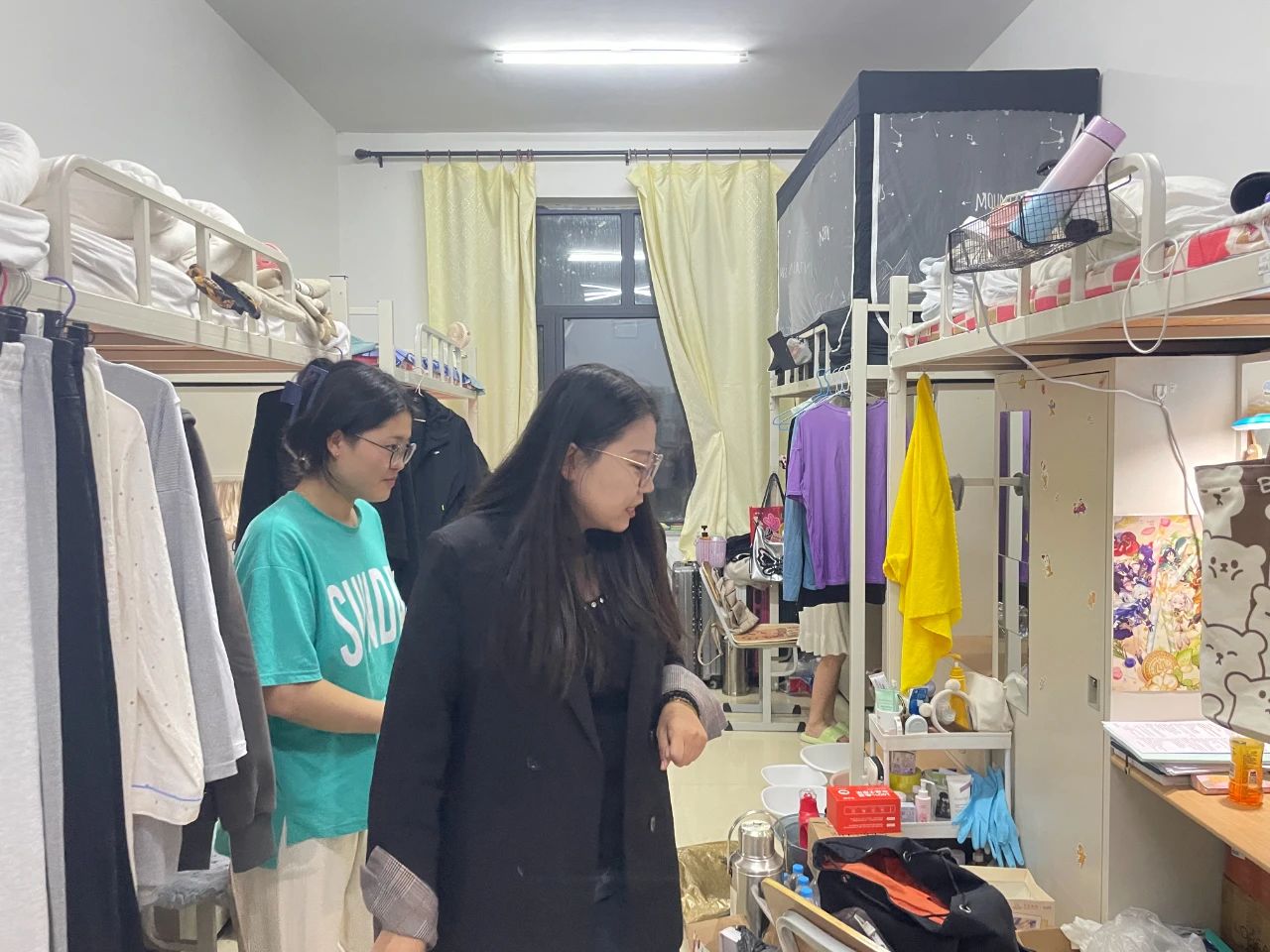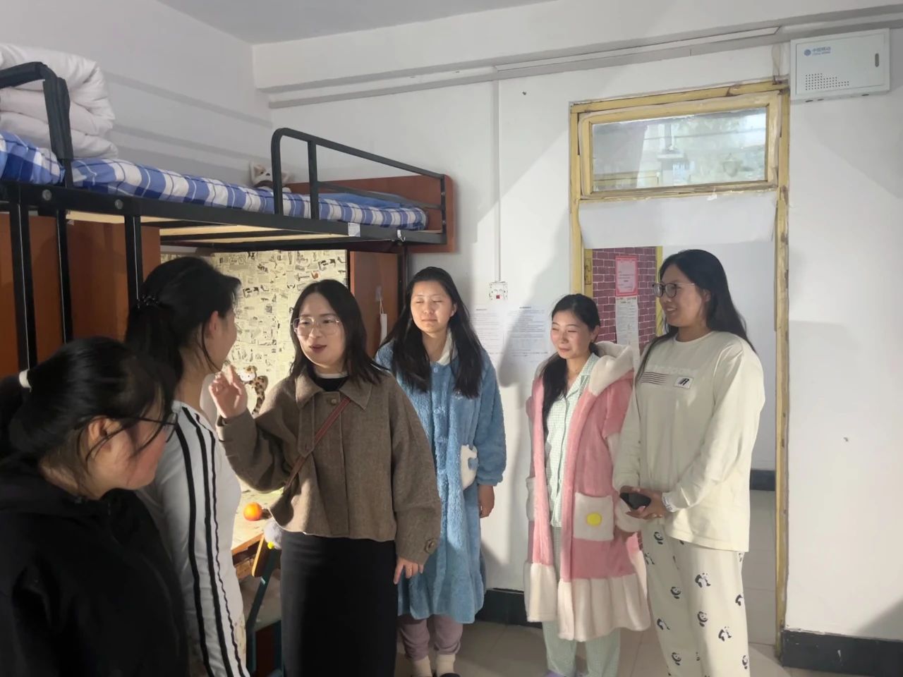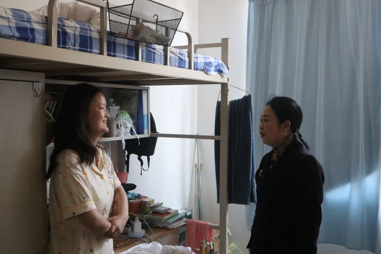老师们亲切与同学们交流互动,了解大家的生活状态,嘱咐各位同学们在宿舍要相互帮助,共同营造一个舒适的居住环境。