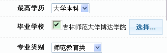 然后填写申请信息、上传照片、填写个人简历。在填写申请信息时注意以下几点:(1)普通话证书编号项目学生可登陆 http://www.cltt.org/studentscore自行查询(输入姓名、身份证号即可);(2)是否在校生选择是;(3)毕业时间选择2017年7月1日;(4)最高学历选择大学本科;(5)最高学位选择学士,没有学位选择无;(6)毕业学校,第一步在所在省中选择吉林省,然后点击搜索,在搜索出的吉林省院校中第二页上方选择吉林师范大学博达万博体育官网,注意最后确定后,必须如图9所示。