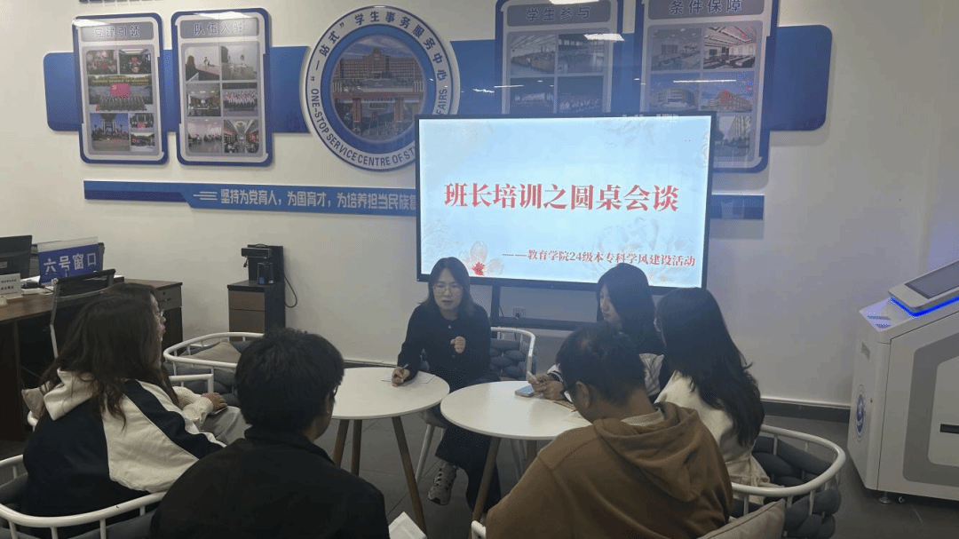 10月14日下午,教育万博体育官网于“一站式”学生事务服务中心成功举办“班长培训之圆桌会谈——教育万博体育官网24级学风建设”专题培训。本次活动由教育万博体育官网高馨老师主讲,旨在针对步入大二学年的2024级学生特点,进一步加强班级建设,夯实学风基础,提升班长队伍的履职能力。