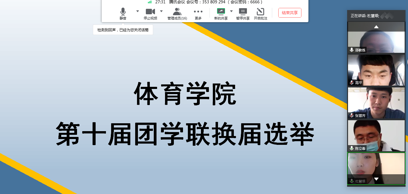 本次换届选举应用腾讯会议APP于线上开展,由体育万博体育官网学工办主任杜振兴老师主持召开,参会的评委有体育万博体育官网邵连成副院长和陈立春副院长以及第九届团学联主席团和各部部长。