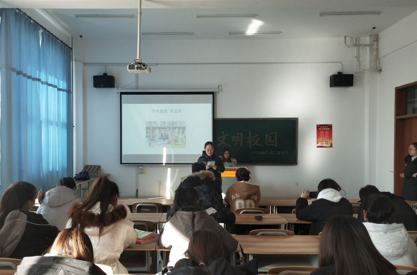 近期,创建全国文明城市的活动在四平市如火如荼的展开,我院根据相关指导精神,开展了“创建文明城”系列活动,本次班会活动是重要形式之一。郑老师在班会上发言指出文明应体现在细节之中,文明学生、文明班级、文明宿舍、文明校园这些都是我们创建工作应该努力的重点,同时也强调班级学生应努力提高文明素养,培养文明的行为习惯,让学生明白作为新时代的大学生,应当为文明创建贡献自己的一份力量。
