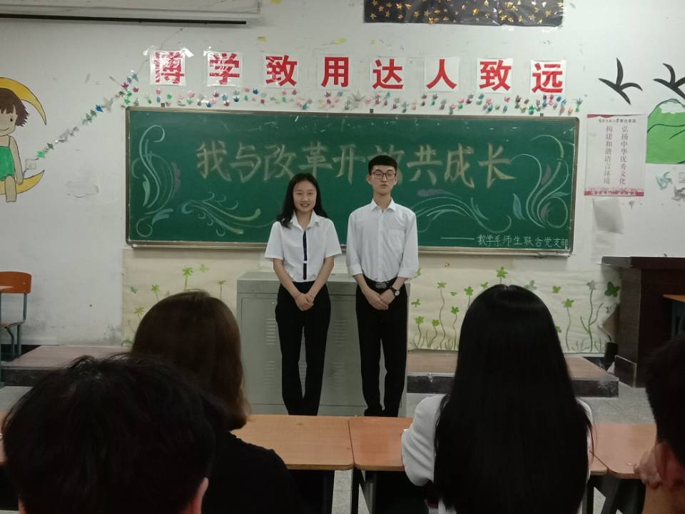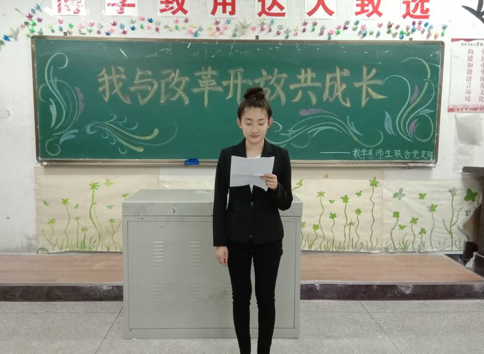6月21日,数学系党支部举办了“我与改革开放共成长”主题演讲比赛。 经过激烈角逐,17级3班王佳宁同学获一等奖,17级2班鞠佳欣同学获二等奖,17级4班郭萍同学获三等奖。 比赛的9名选手围绕纪念改革开放40周年我与改革开放共成长主题,畅谈改革开放40周年来祖国发生的翻天覆地的变化,真情讲述自己或身边人与改革开放共成长的奋斗经历和感人故事,一句句铿锵的话语,一声声动情的诉说,抒发了广大青年学子致力于中国特色社会主义新征程的激情满怀,催人奋进,引发共鸣。 数学系新闻宣传部 杨伟唯 2018年6月21日