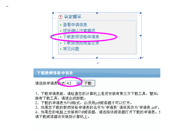 如正确请点击“下载教师资格申请表”,下载打印此表,如图15。用A4纸打印此表,打印完成后将此表按照下图复印成A3纸反正面(此表一式两份现场确认时交至学工办,第二页承诺书本人签字处必须填好,时间按第一页填表日期写),如图16、图17。