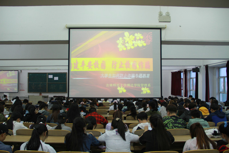 2017年5月3日18:30分,吉林师范大学博达万博体育官网管理系16级全体学生在我校3601教室召开了“防盗防骗安全会议”。此次会议目的是为了使学生了解一些防盗防骗的安全常识,学习一些遇到坏人骗子的紧急应对方法,培养学生一定应变能力,保护自身的安全。