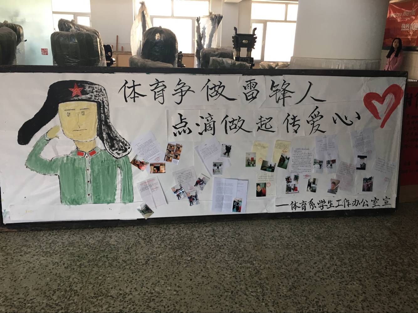 为响应向雷锋同志学习的号召,扩大爱心传递力度,提高同学为人民服务觉悟。三月,体育系开展了“体育争做雷锋人,点滴做起传爱心”活动。