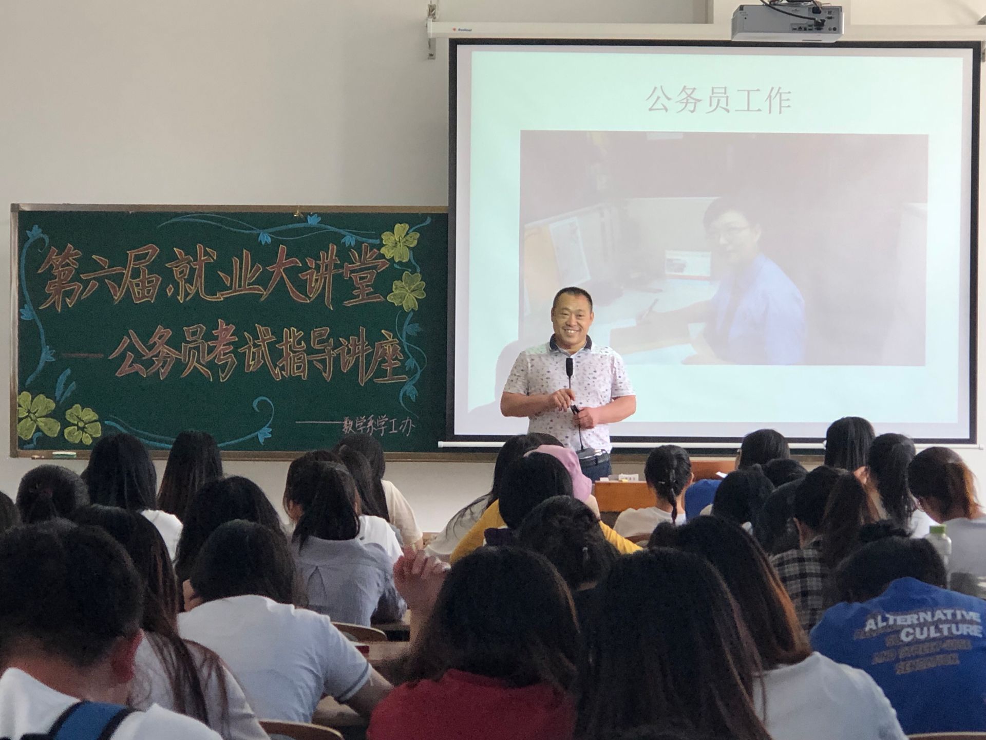 为帮助有志于进入公务员队伍的同学们实现目标,能够在公务员考试中取得佳绩。吉林师范大学博达万博体育官网数学系于6月17日下午14:00在综合楼1111教室举行了“第六届就业大课堂-公务员考试指导讲座”,参加本次活动的有数学系2016级辅导员高泽老师和有意向参加公务员考试的2016级学生。