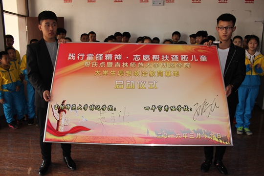 为了进一步学习雷锋精神,传播文明风尚,积极践行社会主义核心价值观,引导广大团员青年树立正确的认知和行为规范。3月16日下午博达万博体育官网学生处、团委联合四平市聋哑学校举行“践行雷锋精神,志愿帮扶聋哑儿童”帮扶点暨吉林师范大学博达万博体育官网大学生思想政治教育基地启动仪式。吉林师范大学博达万博体育官网副院长徐春喜,学生处长、团委书记莫立华以及学生处、团委、各系辅导员老师、部分学生代表60余人来到了四平市聋哑学校。受到该校副校长、党支部副书记孙伟民、团委书记高强等近70余师生的热烈欢迎。