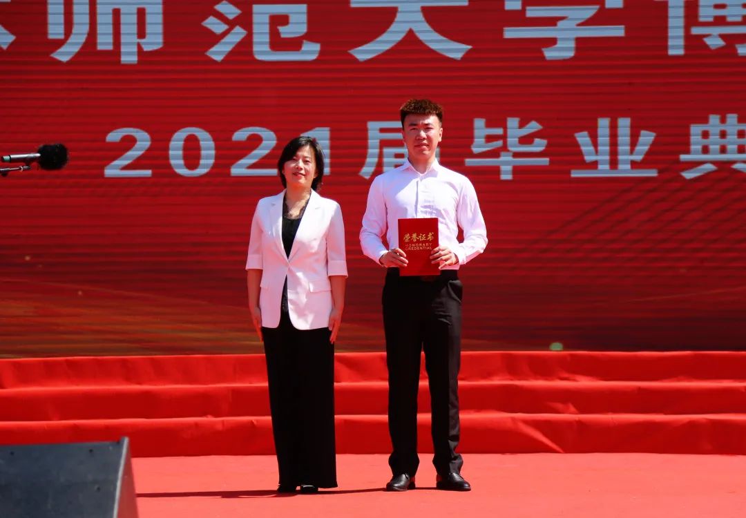 徐焕文为2021届优秀毕业生代表李磊同学颁发优秀毕业生证书。