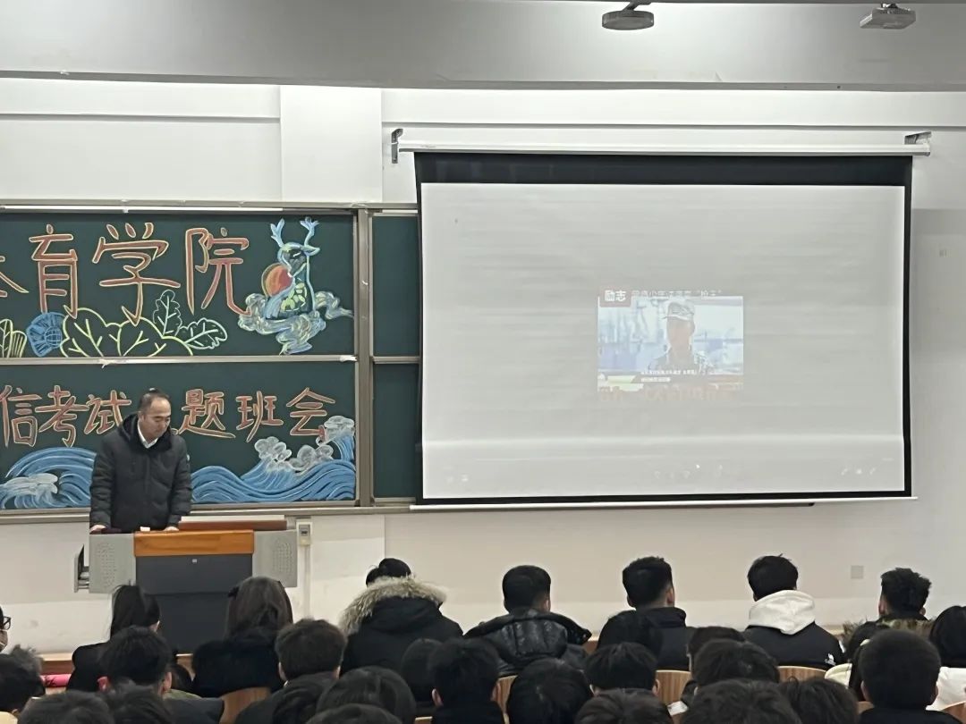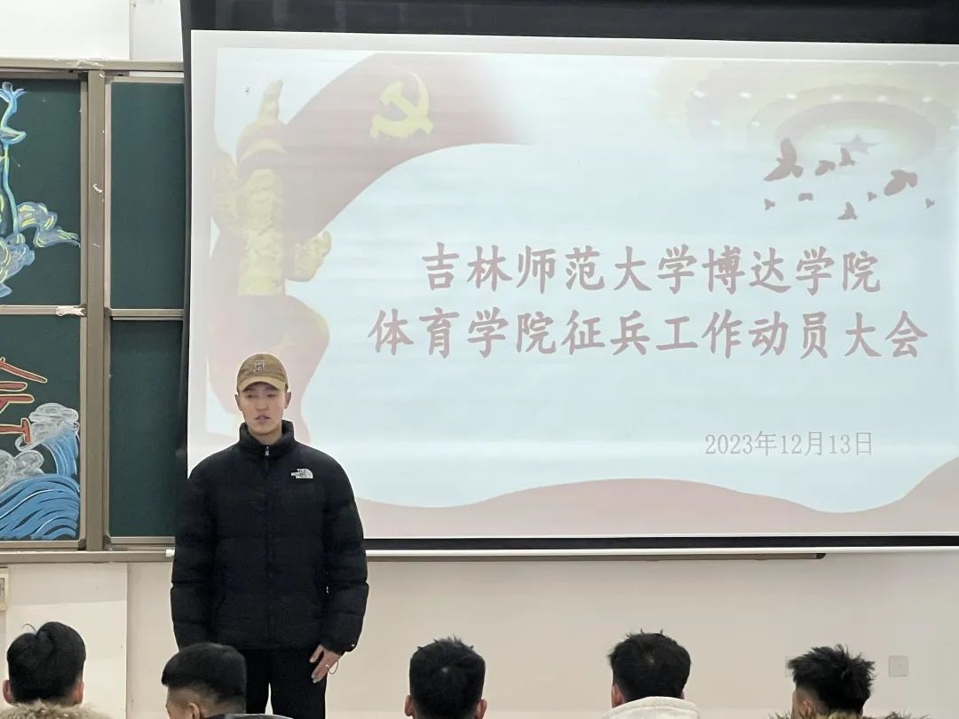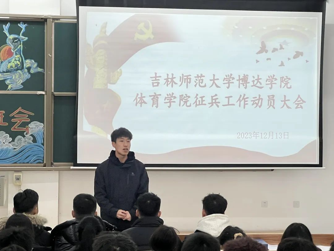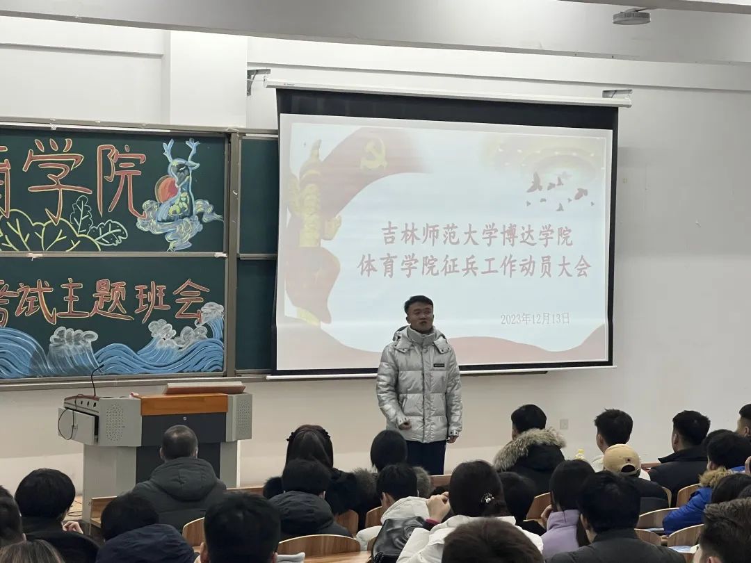 2023年12月13日,吉林师范大学博达万博体育官网体育万博体育官网征兵工作动员大会在综合楼1118召开,会议由学生会主席杨策主持,旨在鼓励学生积极参与征兵,为国家的安全和发展贡献力量。辅导员柳杨老师、夏师澄老师、王婧老师以及万博体育官网21级22级23级全体同学参会。 活动伊始,李帅男、马源声、王力超、谢宗宇等四名同学作为退役大学生代表和同学们交流了个人入伍前后的思想变化,分享了自己在部队的经历和所学到的知识,强调了这段经历对个人成长的帮助。军旅生活虽然辛苦,但是也能让人学到自律、责任感、团队精神等,这些财富对今后的人生会产生积极的影响。为了让同学们更加深入地了解当兵的意义和价值,大会还播放了《热血青春,从军报国》纪录片,展示了军人的英勇事迹和爱国情怀,激发了同学们的报国热情。 柳杨老师做了参军入伍动员讲话,通过枪王全照亮的励志故事,鼓励学生凭借自己的努力成为一名优秀的军人,为国家和社会做出贡献。这个故事激发了同学们的信心和勇气。柳杨老师在会上分享了自己当兵 21 年的经历,老师用生动的语言和亲身经历,向学生们讲述了他在部队中的成长和收获。他表示,当兵的经历让他深刻体会到了责任、纪律和团结的重要性,这些品质也对他后来的教育事业产生了积极的影响。同时,柳杨老师也向同学们详细讲解了当兵的益处,包括对个人成长、职业发展和国家贡献等方面的影响。他鼓励同学们积极参与征兵,为国家的安全和发展贡献自己的力量。 此次征兵工作动员大会的召开,为同学们提供了一个了解征兵政策和军旅生活的平台,激发了同学们的爱国热情和报国决心。相信在学校和老师们的引导下,会有更多的同学积极响应国家号召,投身军营,为国家的繁荣和稳定做出贡献。