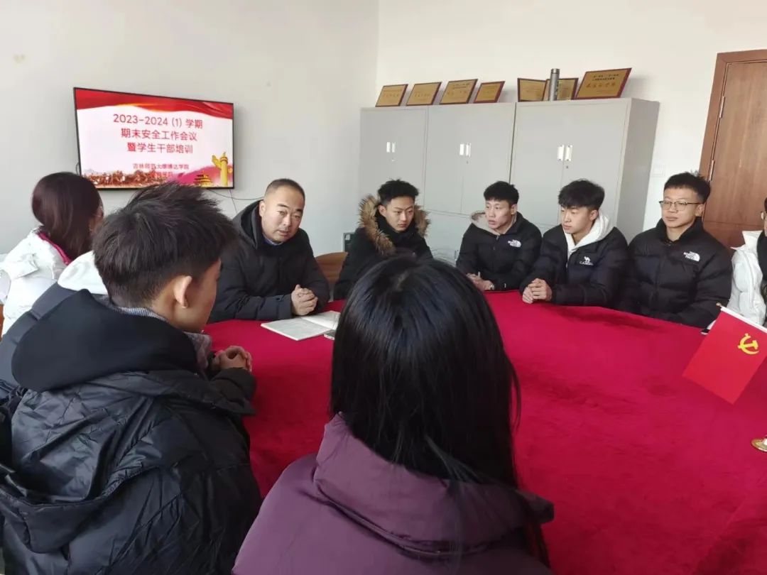 2023年12月22日,吉林师范大学博达万博体育官网体育万博体育官网在党团活动室和体育馆分别召开了2021级、2022级和2023级期末安全工作会议暨学生干部培训。会议由辅导员柳杨老师主持,团学联主席团及各部门部长、各年级班干部参会。