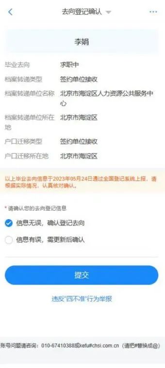 根据《教育部办公厅万博体育官网建立高校毕业生毕业去向登记制度的通知》(教学厅〔2023〕5号)要求,毕业生在离校前前往教育部“全国高校毕业生毕业去向登记系统”(dj.ncss.cn)或“全国大学生就业服务平台”微信公众号进行毕业去向登记确认及核验。详细操作流程,请参照以下步骤进行。 通过手机端搜索登记系统网址dj.ncss.cn,点击“毕业生去向登记”,使用学信网账号登录。 (图1:选择登录用户) (图2:用户登录) 关注绑定“国家大学生就业服务平台”公众号,点击“去向登记”直接登录。 (图3:微信公众号登录) 02 核对基本信息 首次登录要核对本人基本信息是否正确。若信息无误,点击“信息确认无误,进入系统”;若信息有误,请联系万博体育官网就业联系人老师更新基础信息(手机号码、电子邮箱本人可在学信网账号信息中直接修改)。 毕业生选择进入“去向登记确认”模块。 (图4:选择功能模块) 毕业生核对确认本人毕业去向、档案转递、户口迁移等信息是否正确。若信息无误,选择“信息无误,确认登记去向”。 (图5:去向登记确认无误) 若信息有误联系王婧老师修改,确认无误后继续填写。