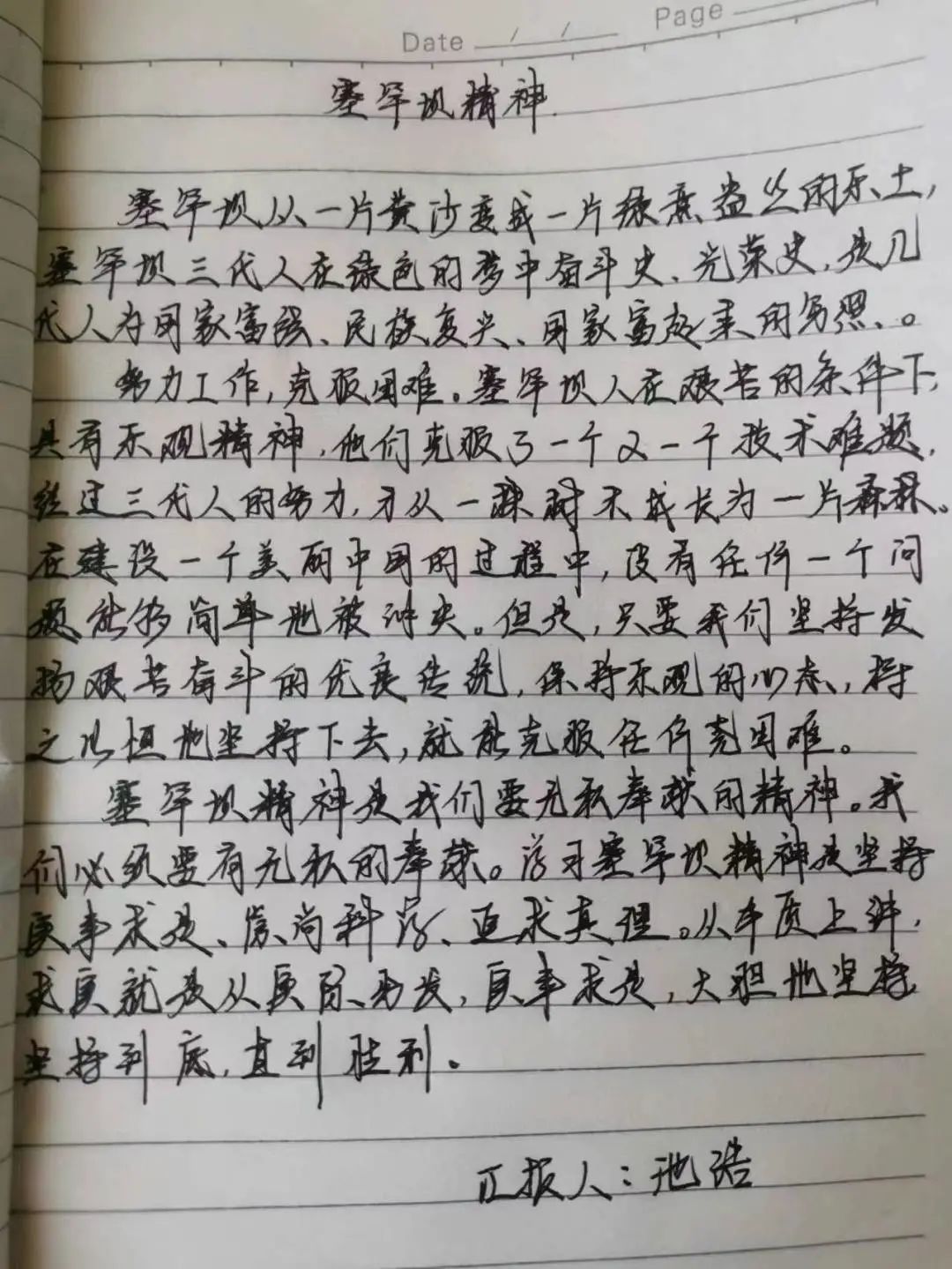 塞罕坝精神是以开拓创新和科学求实为支撑,以艰苦创业为核?,以爱岗敬业和无私奉献为价值取向的?个完整的精神体系。塞罕坝精神既体现了塞罕坝?特有的理想追求,?充满了塞罕坝?献身“绿?事业”的豪情壮志。塞罕坝位于河北省承德市围场满族蒙古族?治县境内, 地处内蒙古?原的东南缘,与河北北部?地相交接, 其地貌形态是?原台地。塞罕坝的意思是"美丽的?岭 ",它东??有 50 公里,南北宽 18 公?。清朝时期设 在此处的"?兰围场",让塞罕坝威名远扬。新中国成 ?后,?代代塞罕坝?薪?相传,“天当床,地当房, 草滩窝?做?房。”他们扎根于塞罕坝 140 万亩的?地之中,?半个多世纪的接?传承,?汗?、?春和? ?之躯,筑起?道守卫京津、保障?态的“绿??城”。现在的塞罕坝,是国家森林公园,有塞罕坝草原、塞罕塔、七星湖湿地公园、?亮湖、泰丰湖等森林草原 景观供游?观光休闲。就在前段时间,总书记来到塞罕坝林场,察看林场?然?貌、看望护林员了解林场弘扬塞罕坝精神。强调塞罕坝精神是中国共产党精神谱系的组成部分,是全党全国??都要发扬的精神。塞罕坝精神是在塞罕坝从茫茫荒漠到塞北“绿?明珠” 天翻地覆的历史变迁中孕育形成的。是?代塞罕坝?在党的领导下创造的?间奇迹。塞罕坝是蒙汉合璧语, 意为“美丽的?岭”。“牢记使命”是塞罕坝精神的根本。为中国??谋幸福、 为中华?族谋复兴,是中国共产党?的初?和使命。在这?初?和使命推进、实现的进程中,不同时空条件下党的不同组织、·不同岗位上的共产党?,担负着不同的使命与任务。“艰苦创业”是塞罕坝精神的核?。艰苦奋?是中国共产党?的政治本?。塞罕坝的建设者始终保持和发扬党的这?优良传统,以?强不息、百折不挠的坚强意志,“功成不必在我”崇?追求,以及 ?于吃苦,乐于奉献的?作态度,不断攻坚克难、开拓前进。本次塞罕坝精神让我受益匪浅。