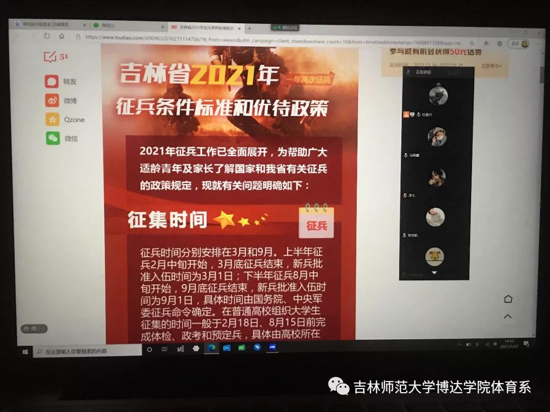 2021年1月22日下午3点通过线上宣讲的方式,吉林师范大学博达万博体育官网体育万博体育官网党支部书记杜振兴老师充分的为我们介绍了2021年征兵条件标准和优待政策。