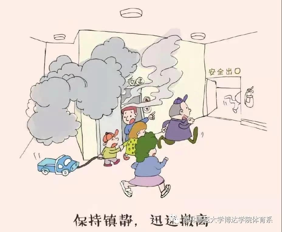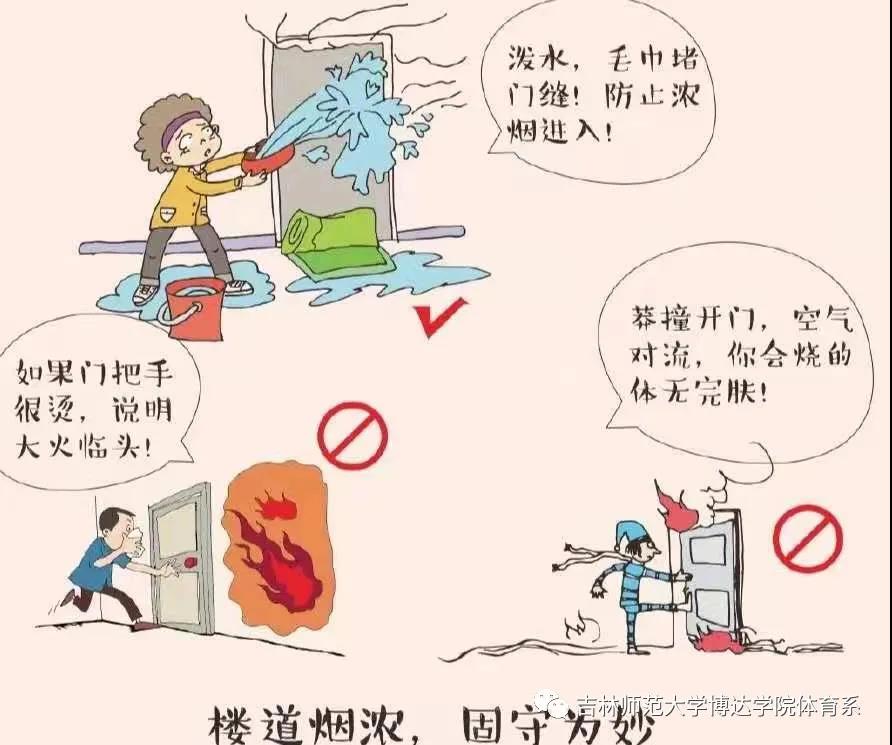 撤离时,在走道里要弯低腰,用湿毛巾捂住口鼻;实在无路可逃时,或跑到天台,或待在宿舍把门缝堵死,要坚信消防员马上到来。
