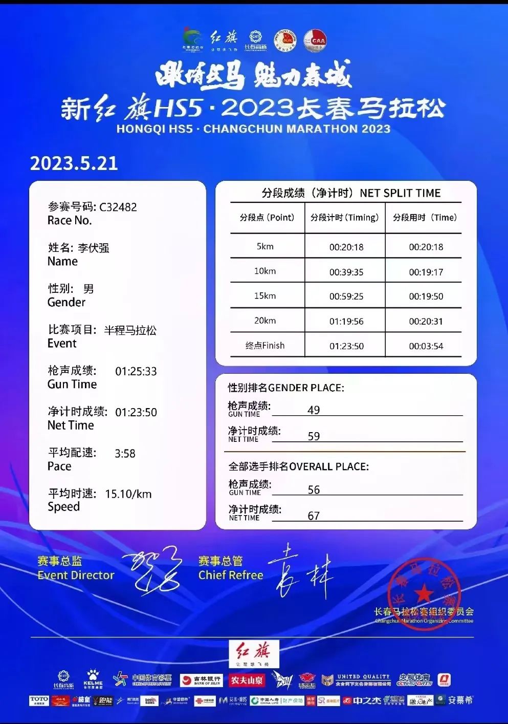 在2023年5月21日,我参加了2023长春马拉松赛,在男子半程组9000名选手中,以1小时23分50秒的成绩,获得第59名,成功达标大众精英级等级。