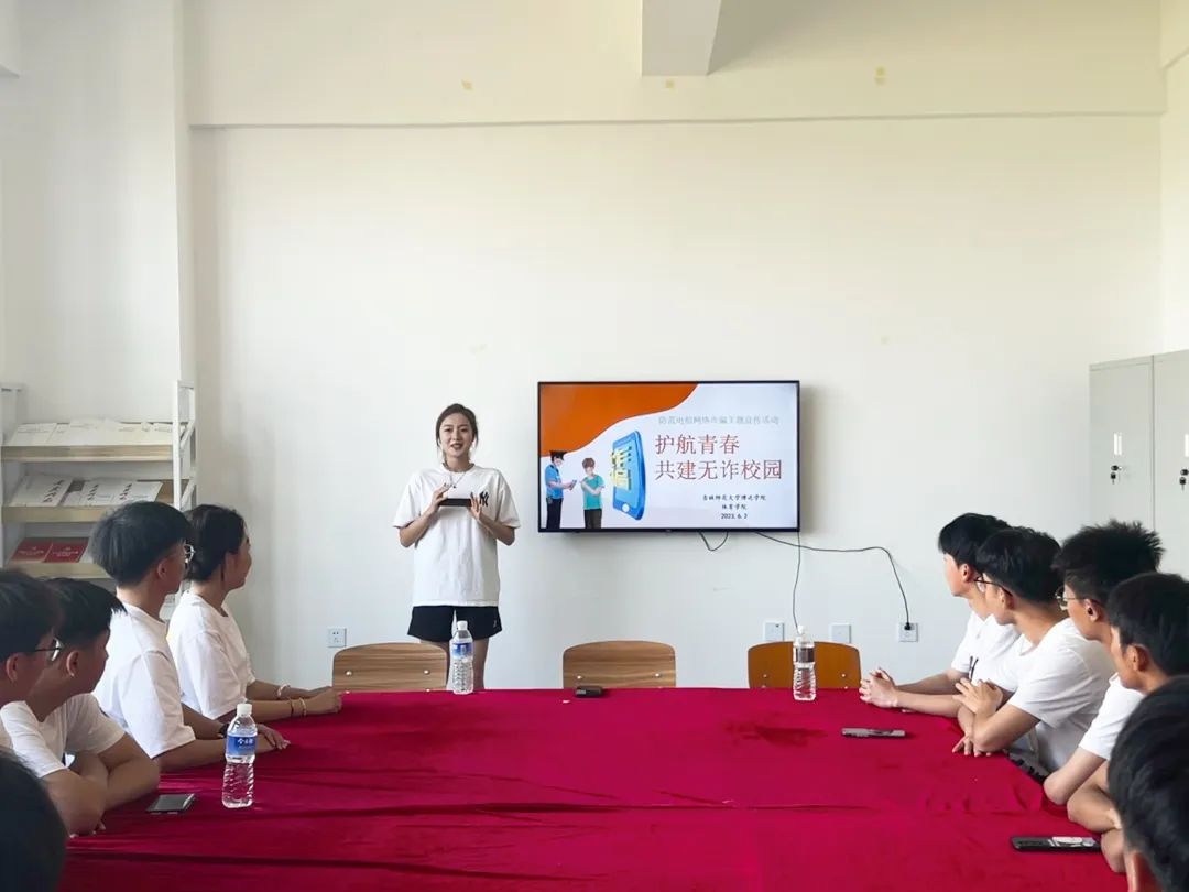 为增强广大学生对电信网络诈骗的防范意识,提高学生的自我保护、自我应对能力,保障学生的财产安全,体育万博体育官网于2023年6月2日在党员活动室作为分会场开展了以“护航青春·共建无诈校园”为主题的宣讲活动。本次宣讲活动是由21级王庆馨同学带领22级学生代表共同参加。