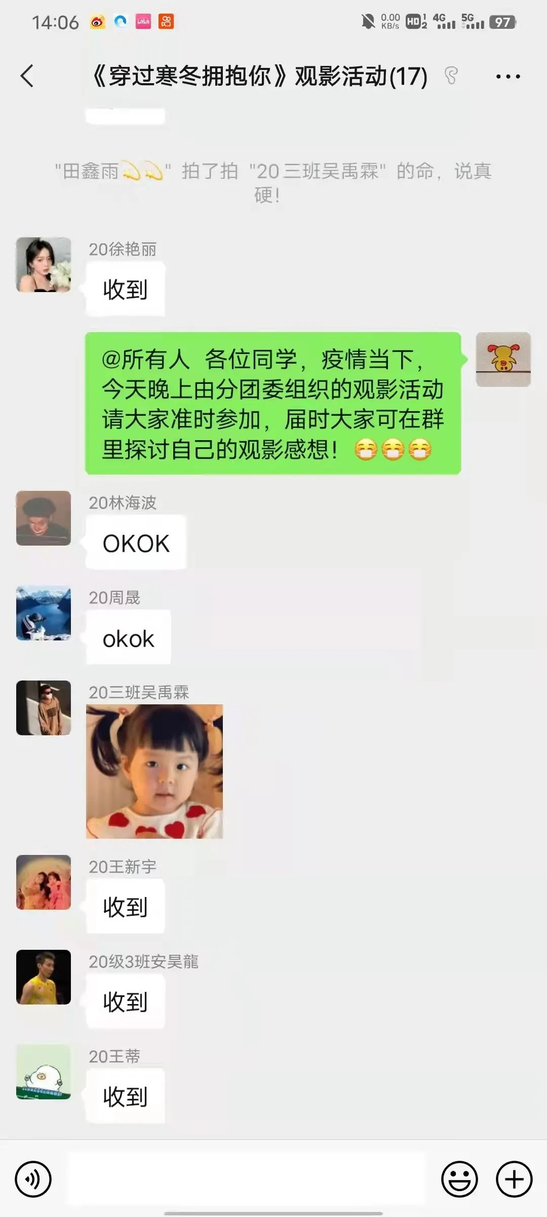 从武汉新冠疫情爆发至今,已有两年多之久,本次观影使同学们,更加珍惜疫情防控的来之不易,懂得人间更有真情在。体会到在危难面前我们中华民族的无私奉献、众志成城的伟大精神。