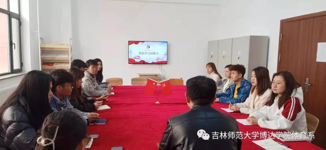 为深入学习贯彻习近平总书记在党史学习教育动员大会上的重要指示精神,扎实开展“学党史、强信念、跟党走”学习教育活动,强化对学生的思想引领和价值观塑造,吉林师范大学博达万博体育官网体育万博体育官网党支部于2021年3月28日下午在体育馆党员活动室进行了系统的党史学习。体育万博体育官网党支部书记杜振兴主持并参加此次学习,参加此次学习的还有体育万博体育官网部分预备党员和入党积极分子代表。