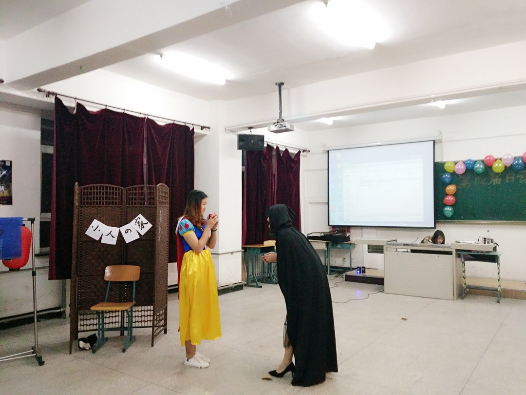 本次演剧大赛有两个剧组进行表演。首先上场的是《深夜食堂》剧组,伴着清缓的音乐声演剧开始了,《深夜食堂》剧组节选了茶泡饭三姐妹的故事进行表演,故事讲述了深夜食堂里以“梅子,鲑鱼,鳕鱼子”为出场台词的三个女人,她们被称“茶泡饭三姐妹”每当深夜总是相约出现在深夜食堂,吃着相同的茶泡饭。把这三个女人串一块的,是她们对“纯爱”的追逐,虽然中途鲑鱼和鳕鱼子曾舍弃了他们的信念,但最后茶泡饭三姐妹又重新走到了一起。故事结束后由两位同学带来了吉他表演和歌舞表演,让观众放松心情迎接第二个剧目。第二个剧是我们所熟知的《白雪公主和七个小矮人》的故事,故事讲述了恶毒的王后为了成为世界上最美丽的人而狠心让猎人杀掉美丽的白雪公主,猎人被白雪公主的善良所打动放过了白雪公主,在七个小矮人的帮助下,白雪公主暂时得到了安全,但是事情还是被王后知道了,她拿着毒苹果准备杀掉白雪公主,就在白雪公主晕倒的时候,王子出现了,他的吻救醒了白雪公主,最终他们幸福的生活在了一起。故事在白雪公主故事的前提下又加入了创新元素,整个故事幽默又有内涵。两个故事一个发人深省一个让人捧腹大笑,相互呼应。最后评委们评出了最佳男演员奖,最佳女演员奖等奖项。 演剧大赛在同学和老师的大合照中圆满结束,本次活动丰富了同学们的课余生活,提高了同学们的学习积极性,得到了老师和同学们的一致好评。