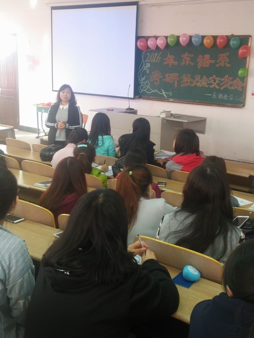 整个会议在轻松的氛围下进行着,学姐们幽默风趣的语言,既道明了重点,又提高了同学的考研兴趣。她们认真的态度赢得老师们的高度赞赏与同学们的阵阵掌声。最后,崔婷婷老师介绍了东语系近年的考研情况,逐年提高上线率,不仅增强了备考同学们的信心,更体现了我系日益提高的教学质量。