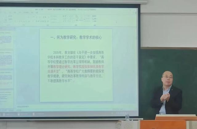 会议伊始,王鹏教授结合多年教学与科研的经验,为教师们解读了我校的工作业绩赋分标准。随后,王鹏教授从何为教学研究、缘何教学研究、因何教学研究、如何教学研究四方面对教学研究进行了详细地阐述。会议最后,教师们互相分享了自己的教学与科研方面的经验和心得,并与王鹏教授深入探讨了更好的教学与科研方法。他们纷纷表示,通过聆听王鹏教授的讲座,不仅拓宽了视野,也对自己的教学和科研产生了深刻的影响,有利于进一步提升自己教学与科研水平。