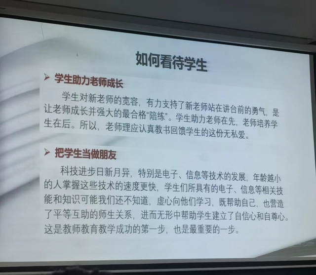 首先,宋慧教授认为学生能够助力教师的成长。学生对新教师的宽容,有力支持了新老师站在讲台前的勇气,也是让新老师成长并强大的最合格的“陪练”,因此学生助力老师在先,老师培养学生在后。其次,我们作为老师,要把学生当作朋友。在科技进步日新月异的时代,特别是电子、信息等技术的发展,年纪越小的人掌握这些技术的速度越快,学生们所具有的电子、信息等相关技能和知识可能比教师掌握的更多。