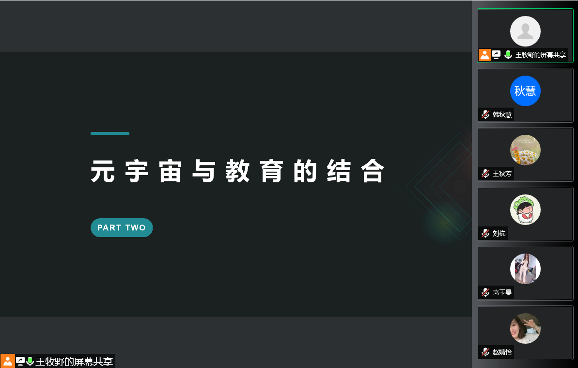 会议主要分为三个部分。第一部分:什么是元宇宙。该部分向各位老师介绍了元宇宙的概念,结构以及相关含义;第二部分:元宇宙与教育的结合。该部分向各位老师介绍了元宇宙,即虚拟现实技术如何与教育相结合的,并介绍国外一些大学已经进行的虚拟课堂的教育实践;第三部分:元宇宙教育对教师的挑战。在了解了何为元宇宙以及元宇宙和教育是怎样结合的之后,各位老师开始讨论在虚拟课堂的背景下教师们该如何紧跟时代,提高自己的授课质量,以及如何应对在虚拟现实教学中可能存在的一系列问题。